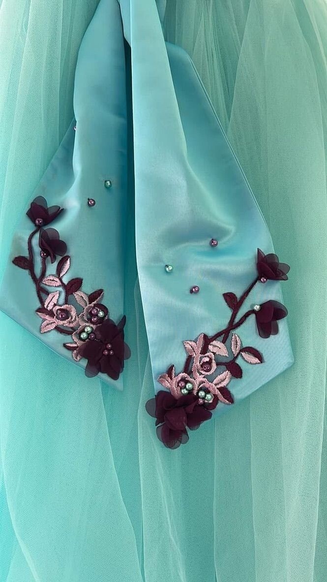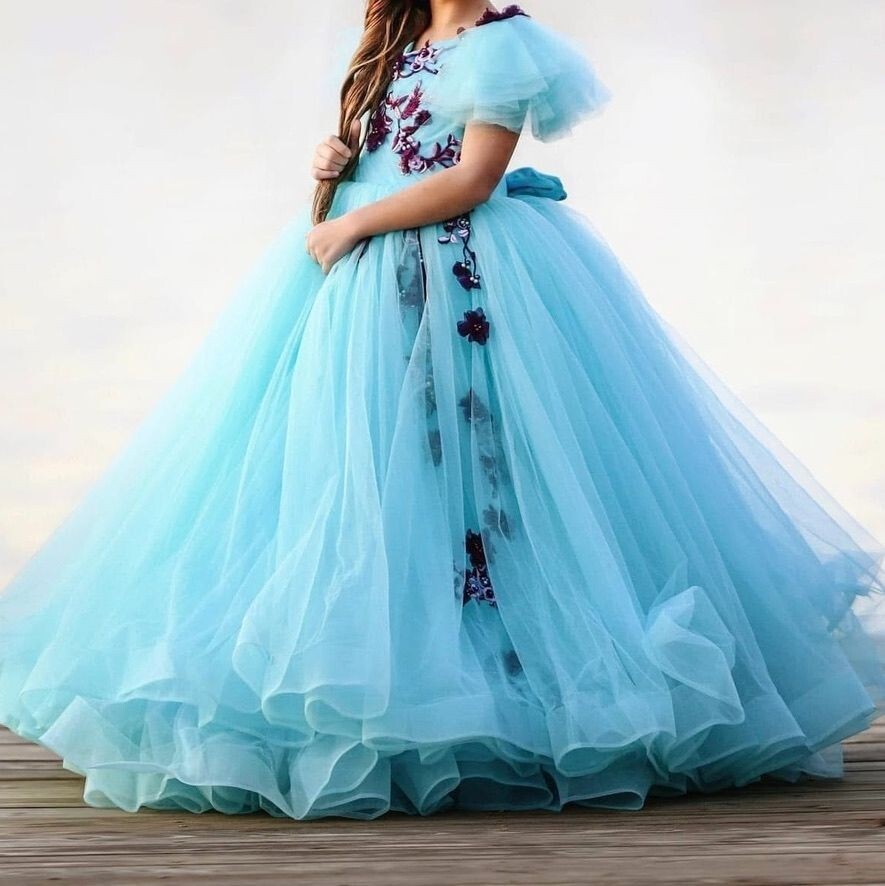 Step into a fairytale with this enchanting aqua blue ball gown by Anna Triant Couture. Its ethereal tulle layers and intricate floral embroidery weave a story of elegance and whimsy.