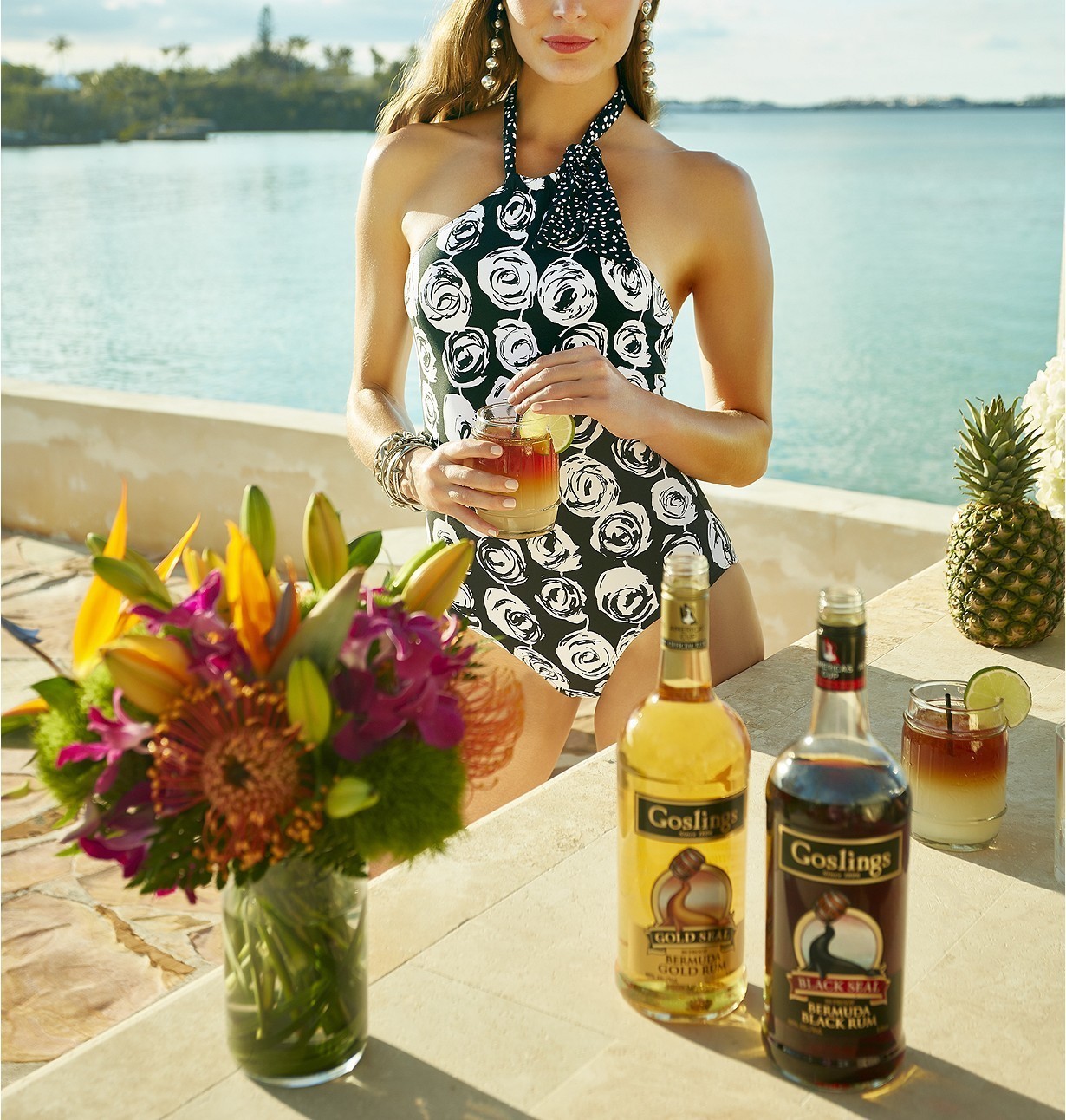 Look chic in this high-neck rose print one-piece