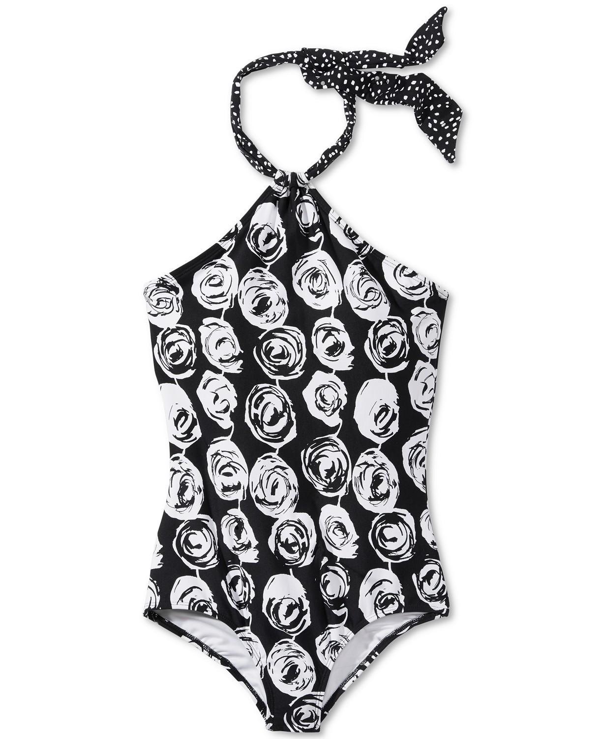 Monochrome maven: The Anne Cole Coming Up Roses Scarf High Neck One-Piece Swimsuit has unique flair fit for any beach and boat lounger this summer. Anne Cole's halter swimsuit is made even more striking by haute angles and a bold, black-and-white motif. A contrast neck tie and trendy high neckline makes this a one-of-a-kind swimsuit.