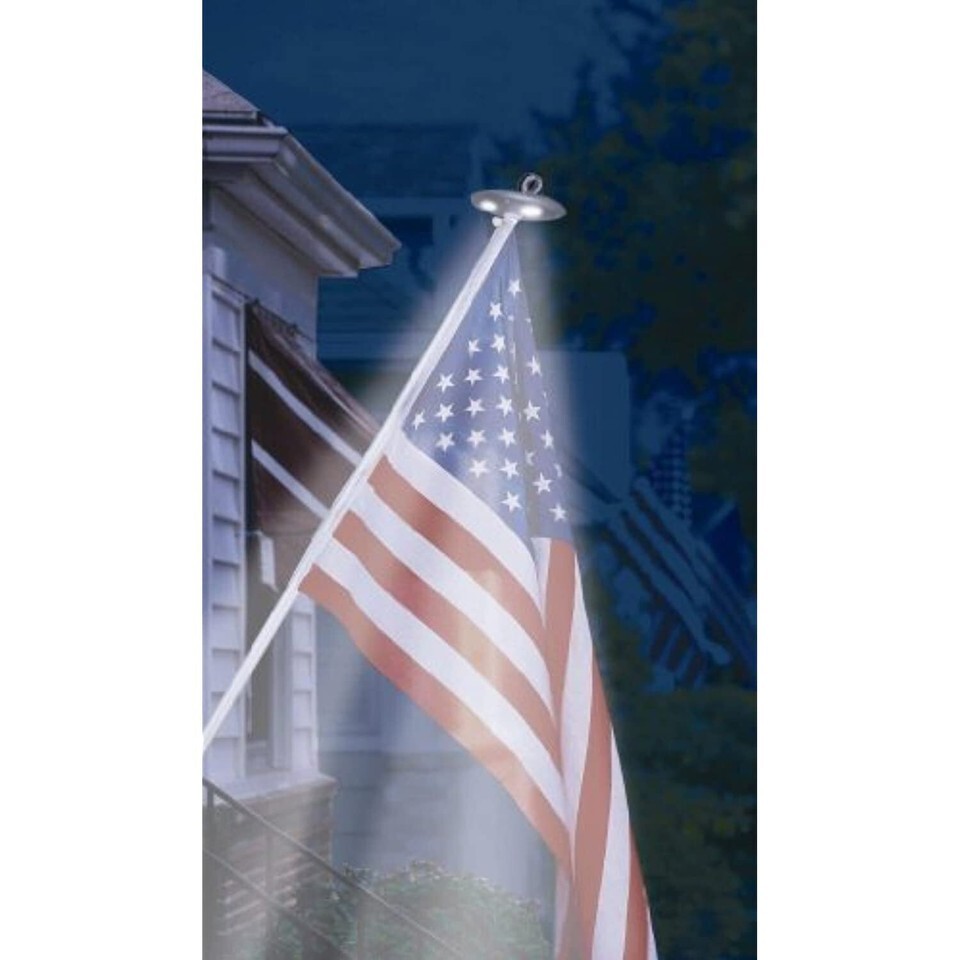 This is a solar LED light for residential flagpoles This solar flag light is powered by solar energy through the solar panels The panels convert the sunlight into electrical energy then charge the 1 2V Ni-MH rechargeable battery during the day A light sensor turns on the flag pole solar light automatically at night Ideally, the solar light for flag pole should be in a place to capture the maximum amount of sunlight The light source is super bright LED's which can work up to eight hours at night after a full sunny day of charging It is easy to install and no special tools are required The self charging battery is included This solar flagpole light was developed for flagpoles 5 ft to 8 ft and it includes three angle-adjustable adaptors to accommodate most 1 inch diameter poles
