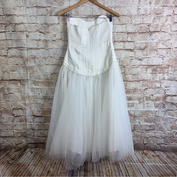 Anthropologie BHLDN Strapless A-Line Satin Tulle-Skirt Midi Dress Size Small NEW - Ivory - Viscose Nylon - This BHLDN design combines a structured satin bodice and a wispy tulle skirt-a captivating midi crafted for reception-ready elegance. Midi length, A-line silhouette, Back zipper with hook-and-eye styling, Strapless sweetheart neckline, satin corset bodice lulle skirt