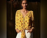 Anthropologie Kendra Dandy Dreamers Yellow Red Western Whimsy Blouse Size 10 - Viscose - button front that ties at hem, whimsical print, V-neck, elastic cuff sleeves