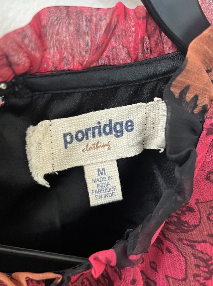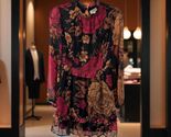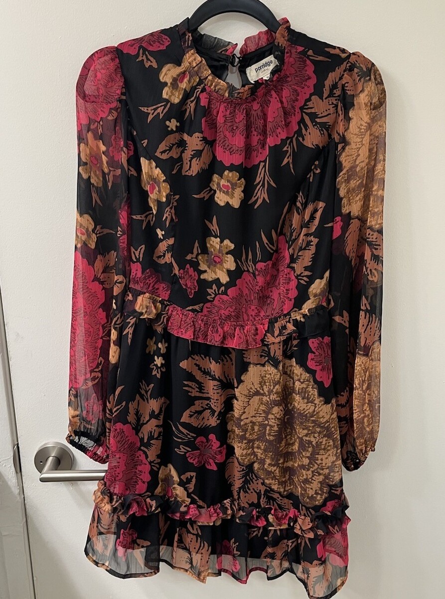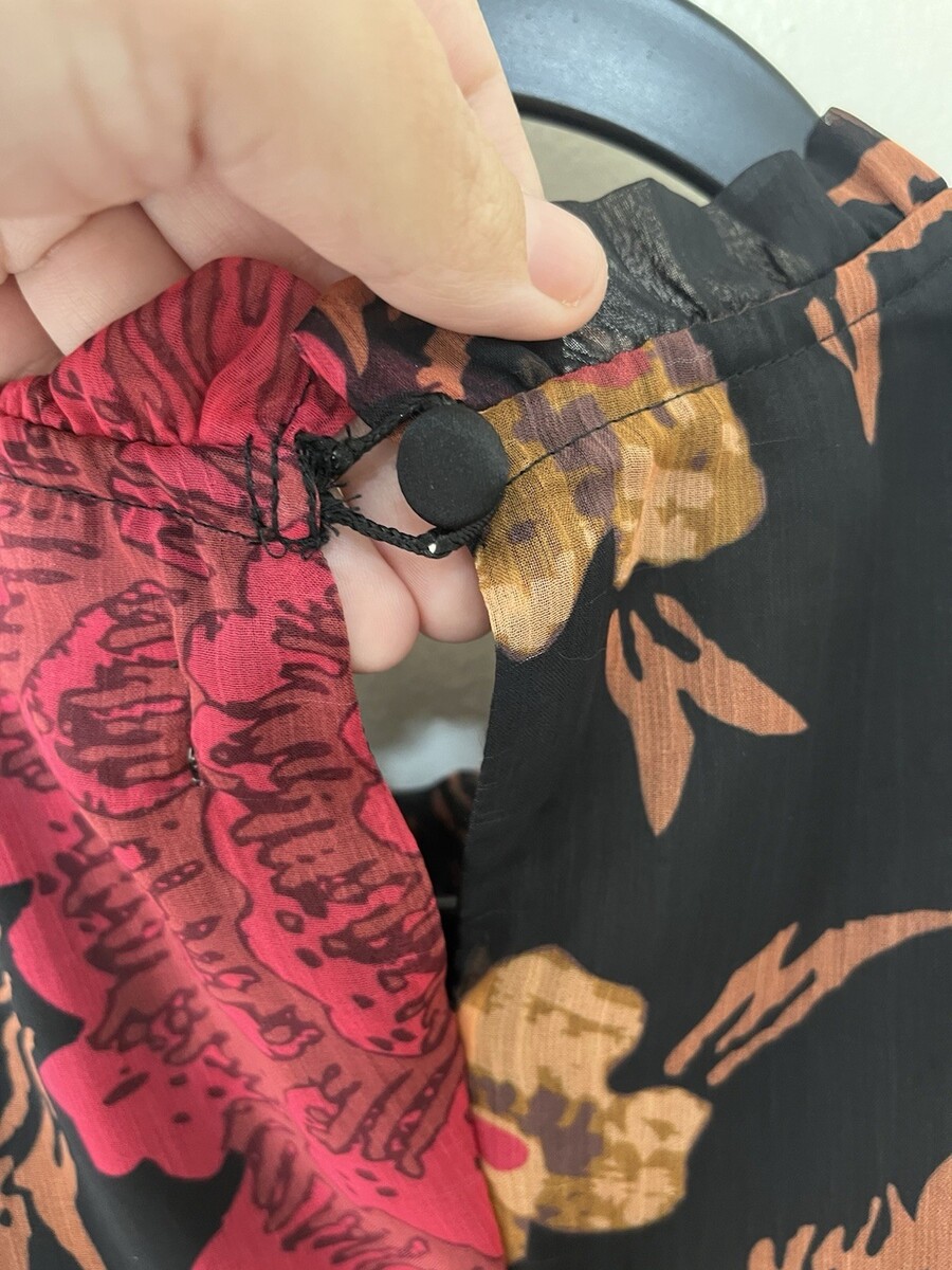 The Anthropologie Porridge Puff Sleeve Open Back Floral Mini Dress in Black is a stylish and versatile piece perfect for various occasions. This short dress features balloon sleeves, a mock neck with a button accent, and a flattering fit and flare silhouette. Made from lightweight fabric, it is ideal for summer parties or formal events, with details like a backless design and sheer fabric adding a touch of romance and flair. The floral pattern make it a stand-out choice for those looking for a chic and feminine option for their wardrobe. The button hook on the back of the dress is a little loose/stretched out and on the front of the middle bodice of the dress there are a few little marks in the fabric as shown in photo. Please let me know if you have any questions!