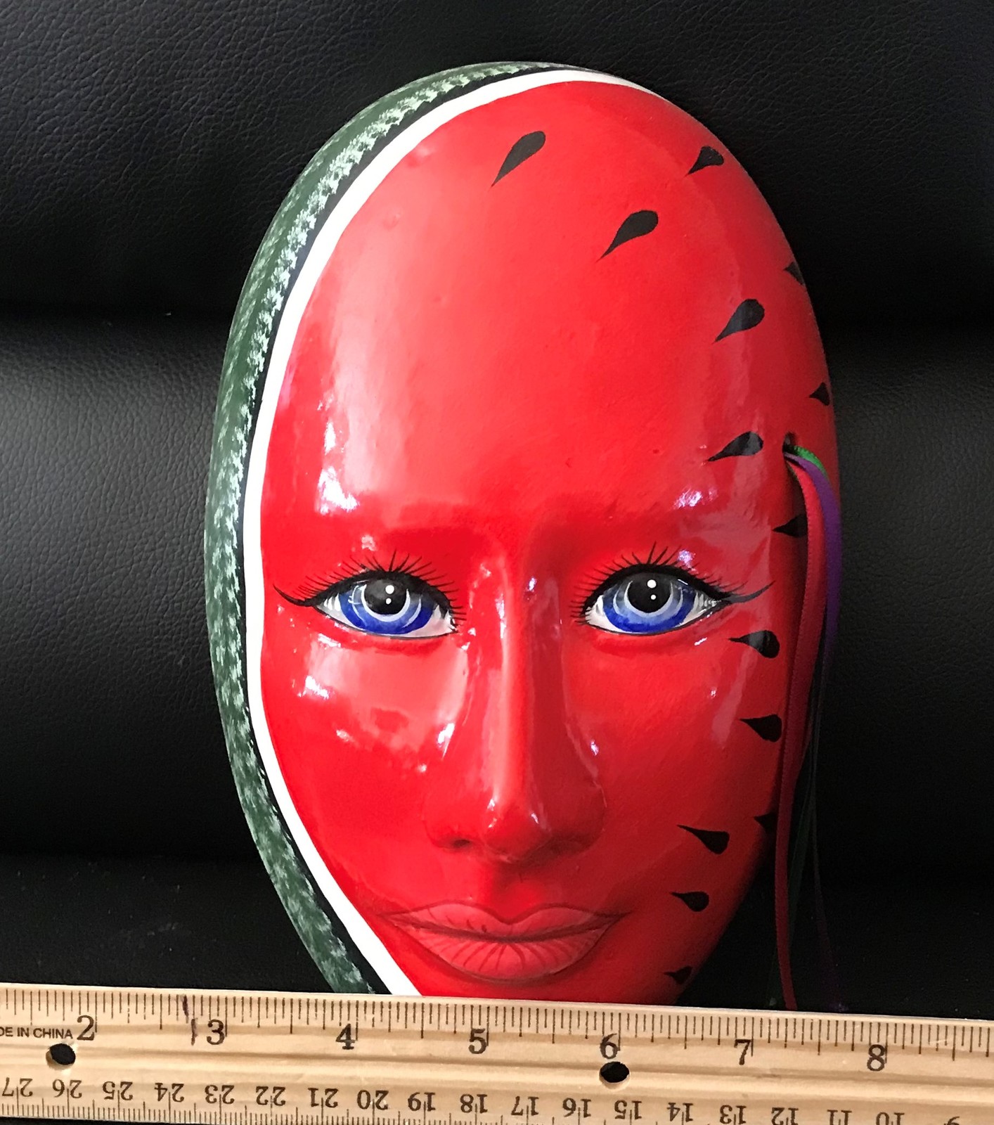 Purchased from an unusual estate many years ago, this beautiful watermelon wall mask from the 1980's is in perfect condition. It's likely that this was a product of a Central American country. One thing that's for sure is that its bright, it's bold and it's guaranteed to brighten up any area that you hang it.
