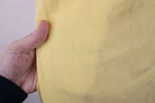 Stain front. Graphics faded. Collar, arms discolored. Color faded. Dark spots, pilling. Made in USA
