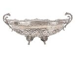 Piatto antico 800 con piede d'argento con manici Ciotola antichi centratavola in argento Piatto jardiniere con manici di fogliame Repousse Roses dappertutto. Ha una testa fanciulla e capelli figurali ai piedi. Rari piedi di cast Stampato "Ay 800" Peso lordo: 382,6gr Misure: 5 pollici. H x 11 1/8 in. L x 6 5/8 in. W