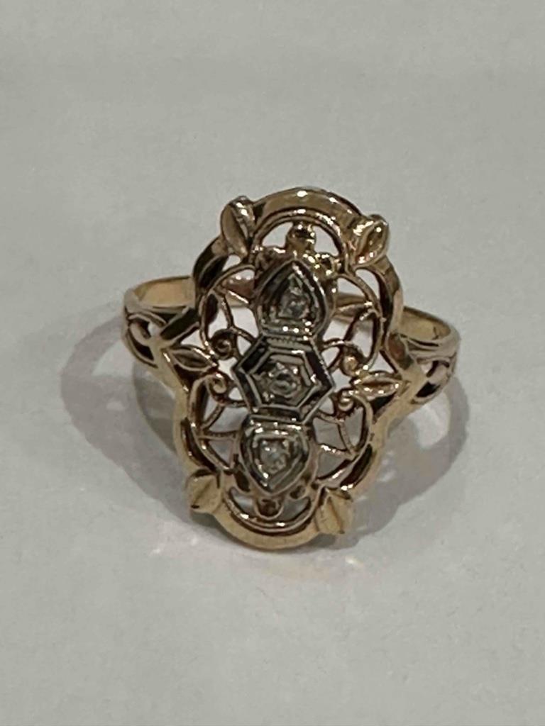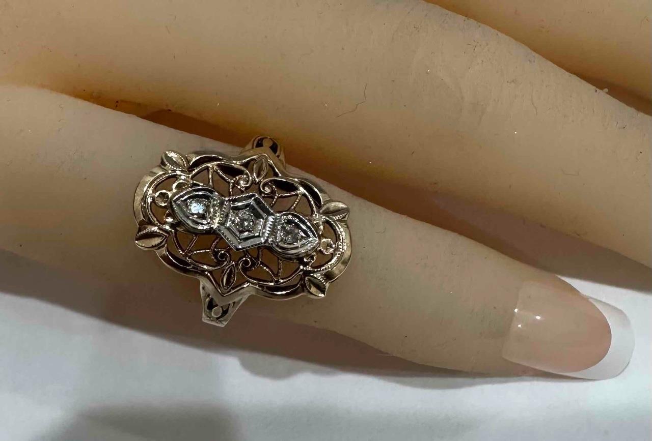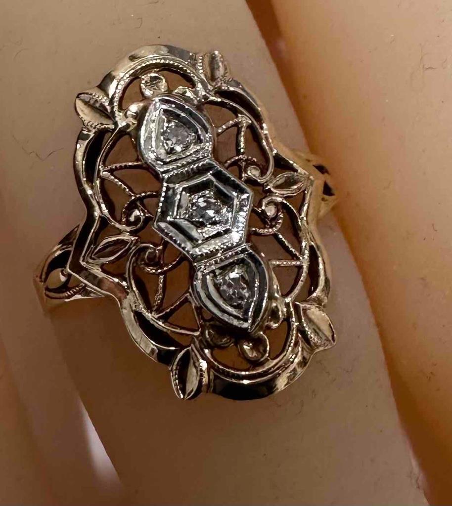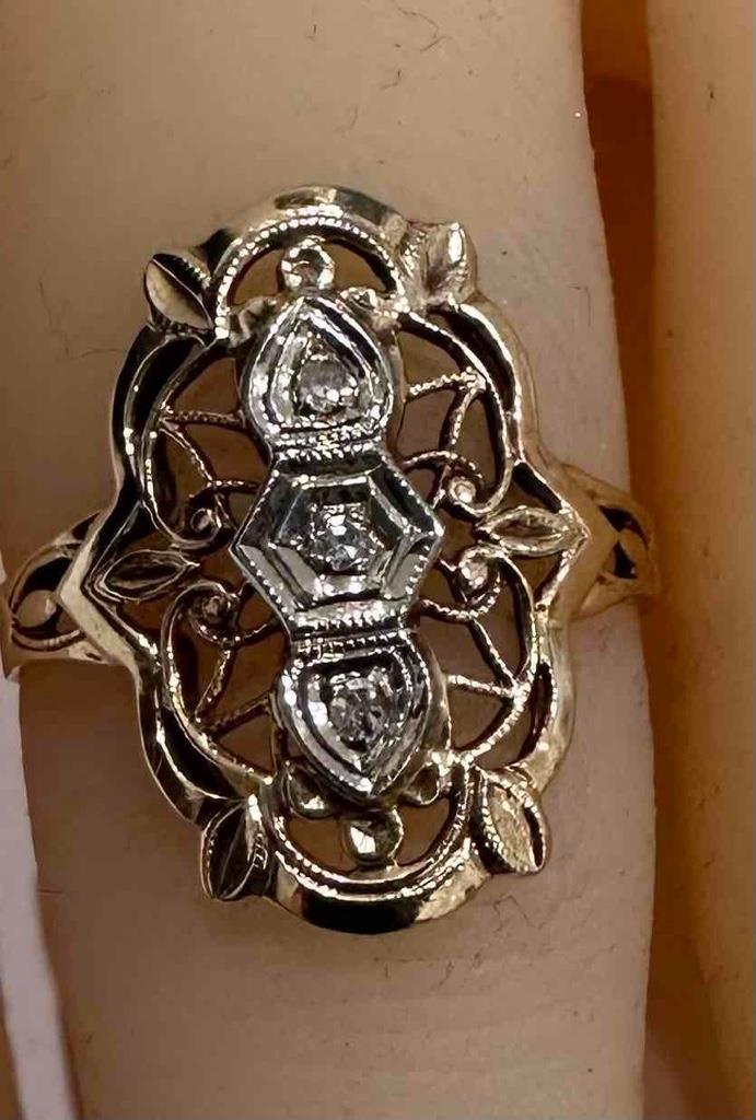 - ANTIQUE 14K YELLOW GOLD FILIGREE ART DECO RING WITH DIAMOND ACCENTS SZ 5
