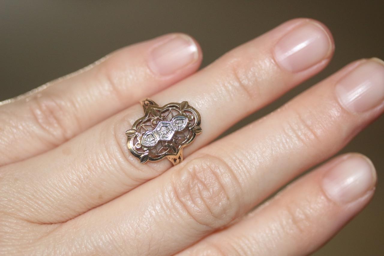 Offered for sale is a lovely filigree art deco ring with 3 tiny single -cut diamonds crafted in 14 karat yellow gold with small white gold detail in front.