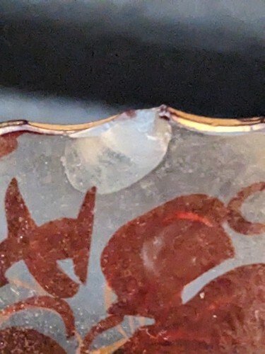 Up for sale is a used Antique Bohemian Ruby Red Glass Enamal Flower Gold Ruffle Rim Chip that measures 5.25 x 5 Inch