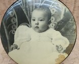 Antique celluloid photograph button / medallion. This piece shows a young infant/child circa 1900s in a Christening Gown sitting on a wicker chair --if you look close at the upper right corner of the picture you can tell tha someone is holding the baby up. The button is metal and has a stand for displaying the photo. It was made by Columbia Medallion Studios in Chicago.