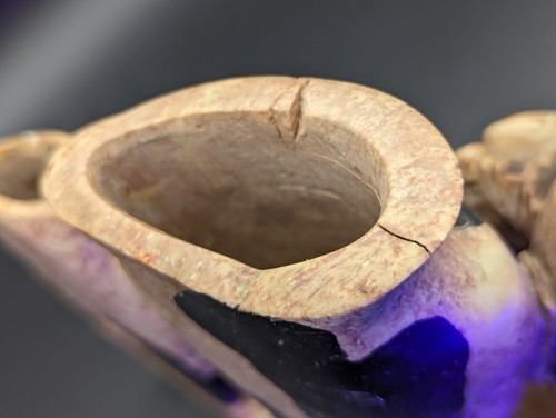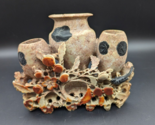 This antique soapstone sculpture vase features a stunning hand-carved design with intricate details of a black bird and a nature scene. The piece stands at a height of 6.5 inches and is made of soapstone, a primary material known for its durability and elegance.