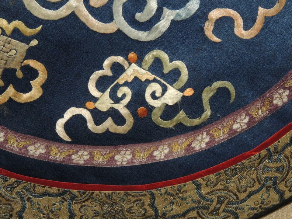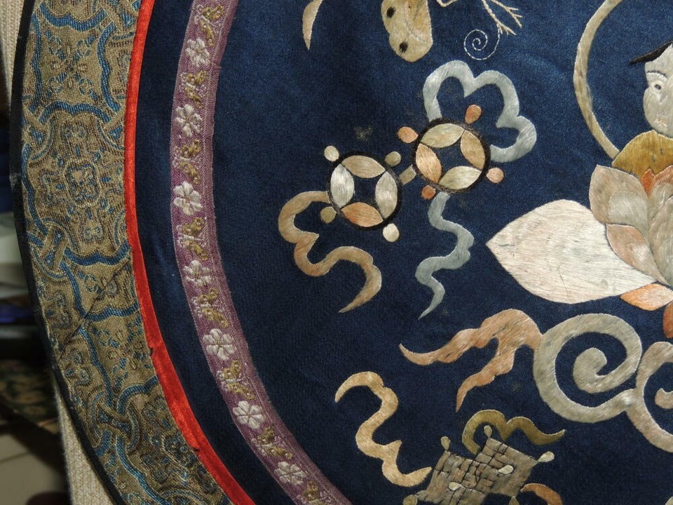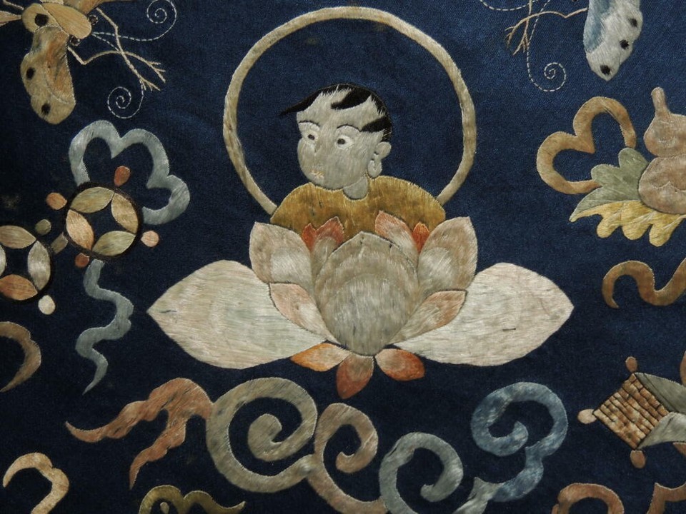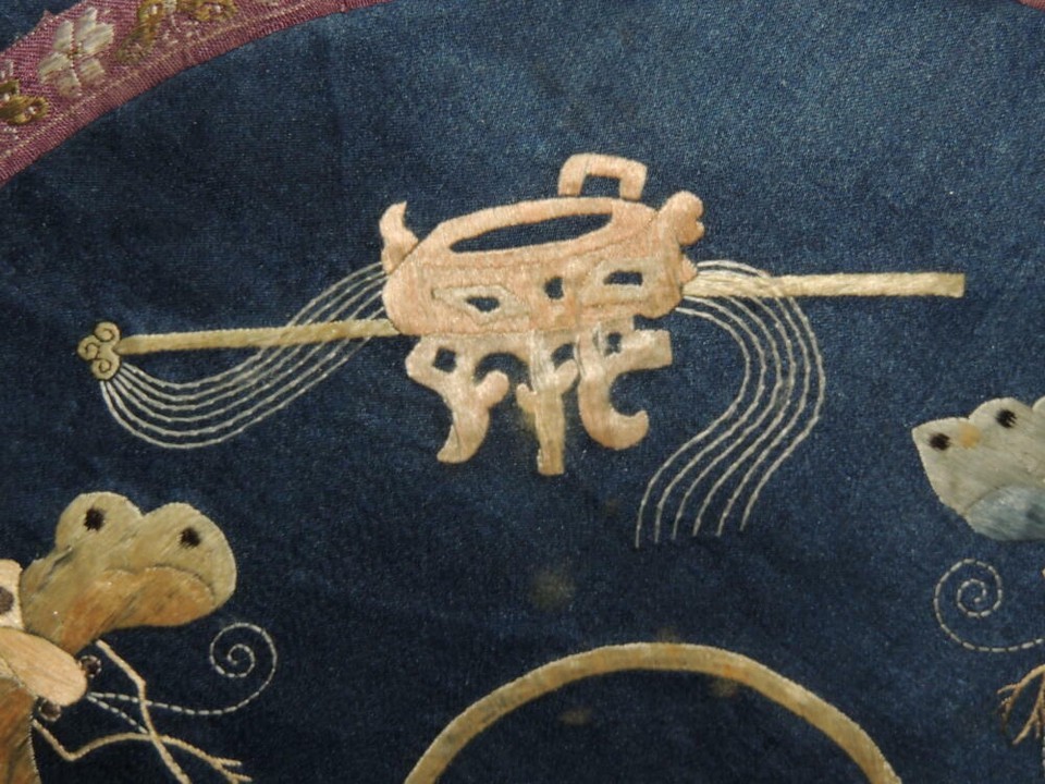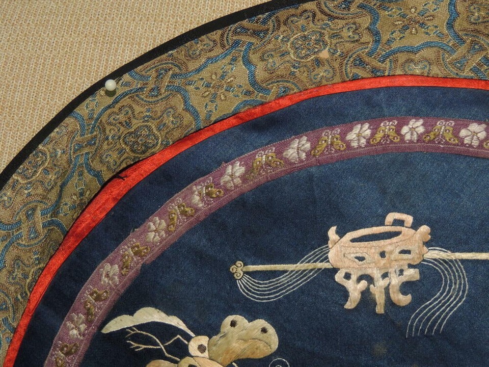 - Antique Chinese Silk Embroidery 15" Panel Tapestry round boy lotus dragonfly