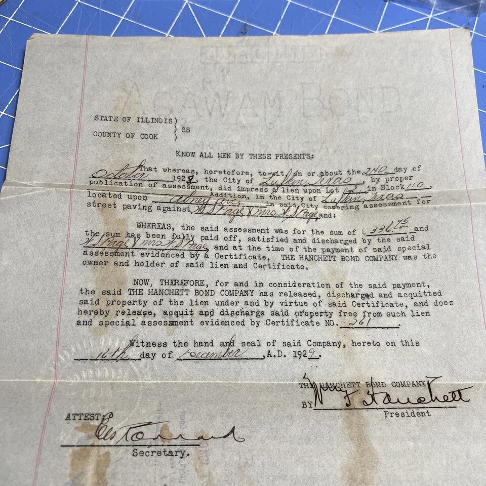 - Antique Court Document Hanchett Bond Company Signed 1929 Cook County Notary
