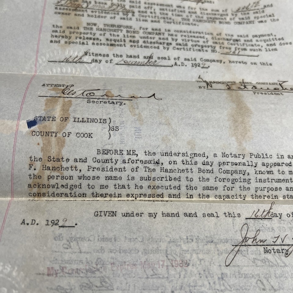 Antique Court Document Hanchett Bond Company Signed 1929 Cook County Notary