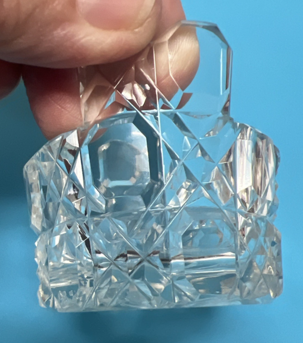 Antique Cut Crystal Bucket Shaped Open Salt Dip Grid Design 1 3/4 tall at the handle x 2 wide x 1 1/8 In on the side wo handle It has a flea bit on the bottom side edge