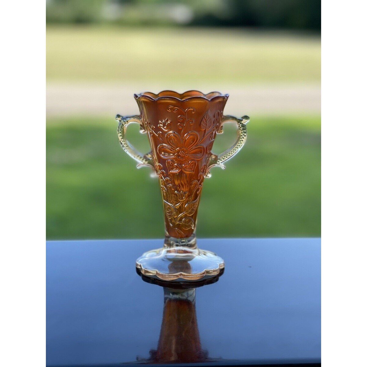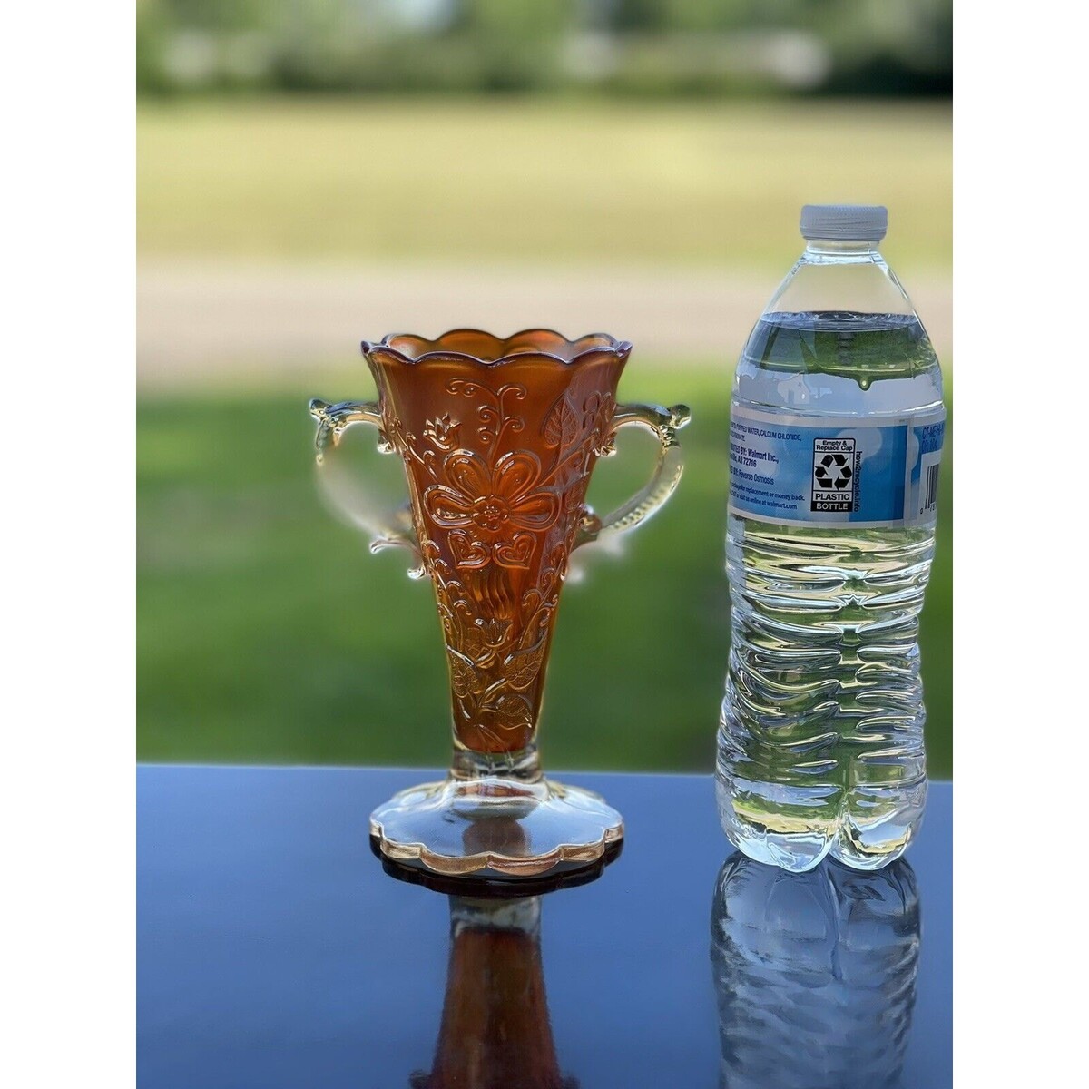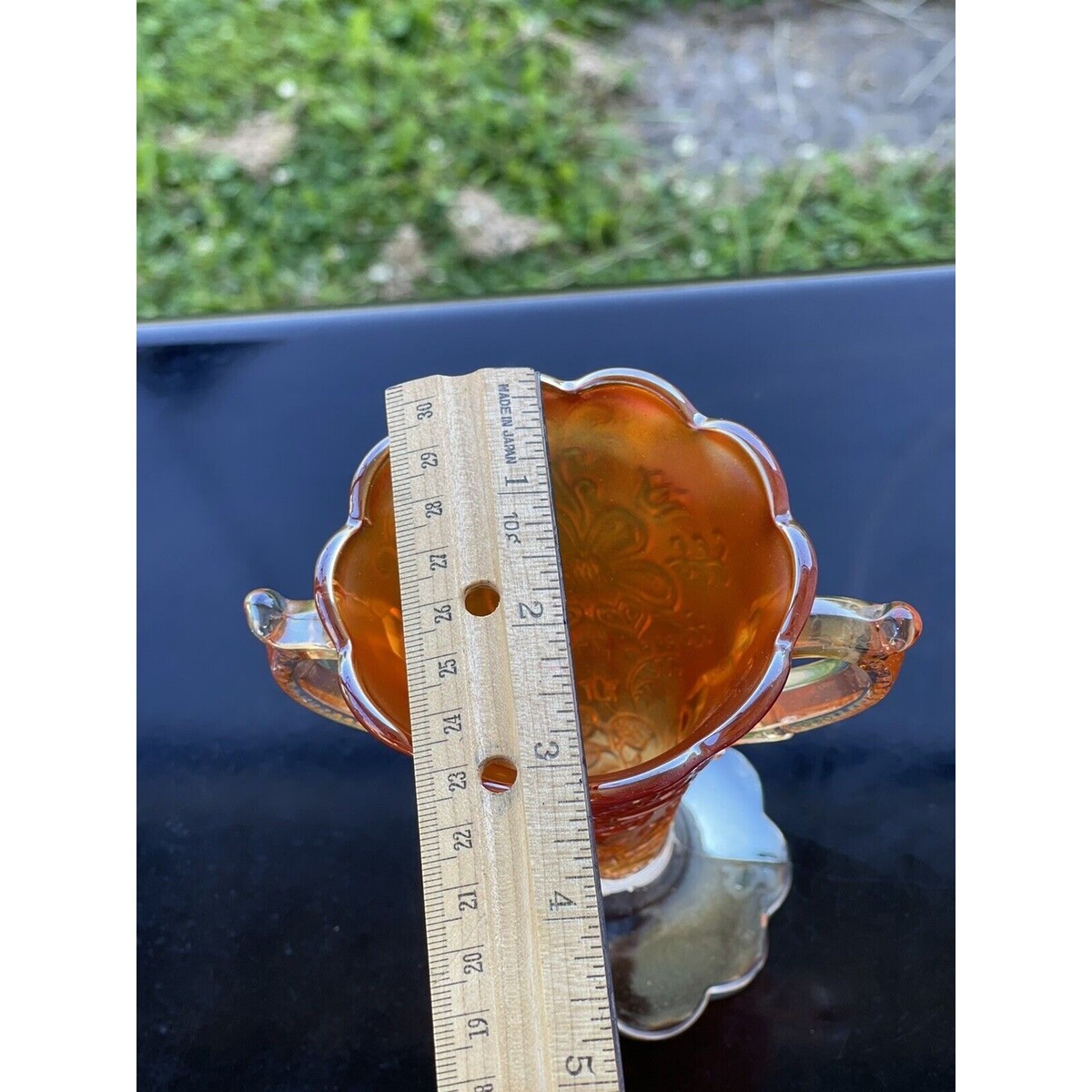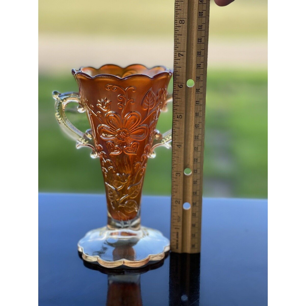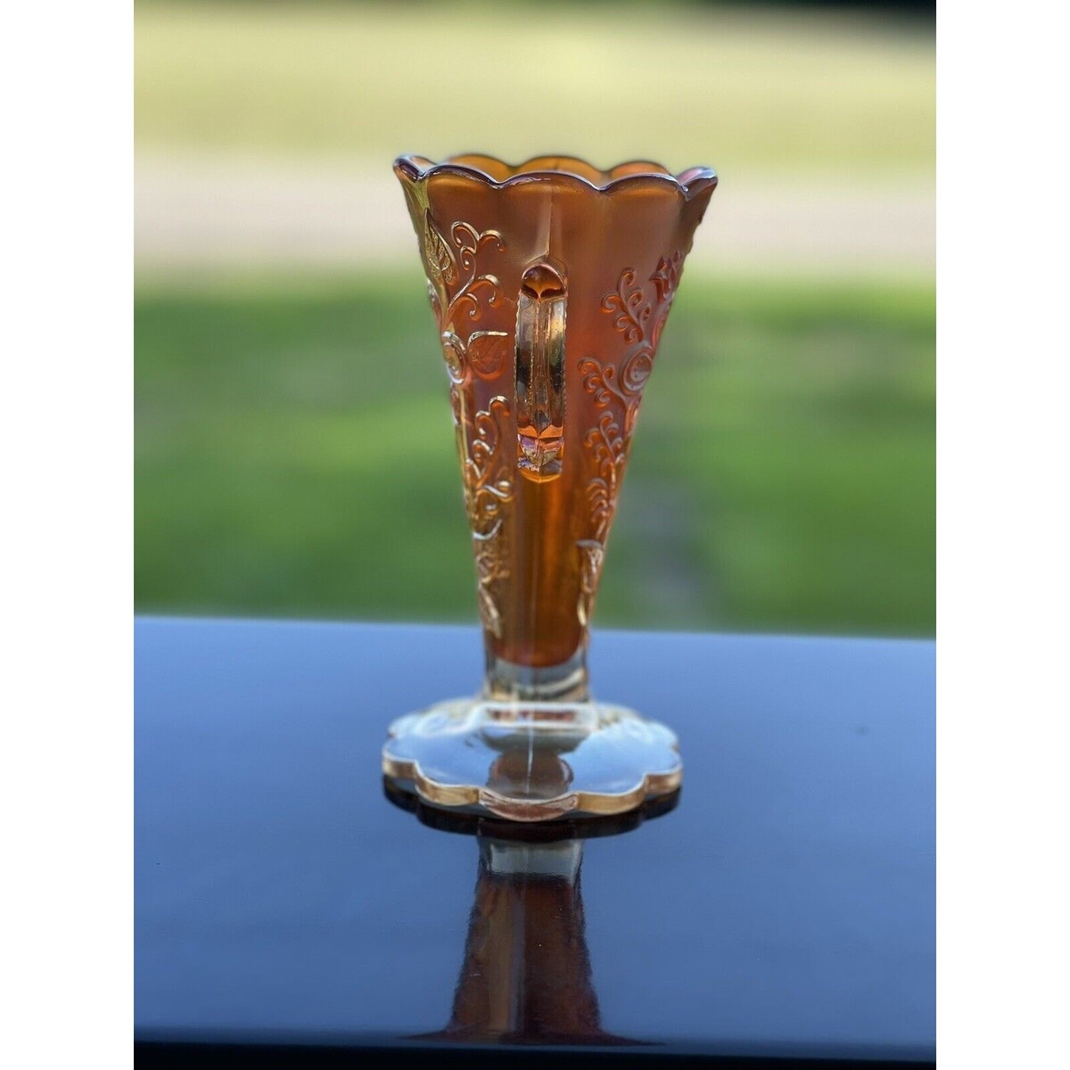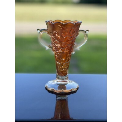 - Antique Dugan Mary Ann 6-1/4” Marigold Glass Handled Footed (c 1915) Vase