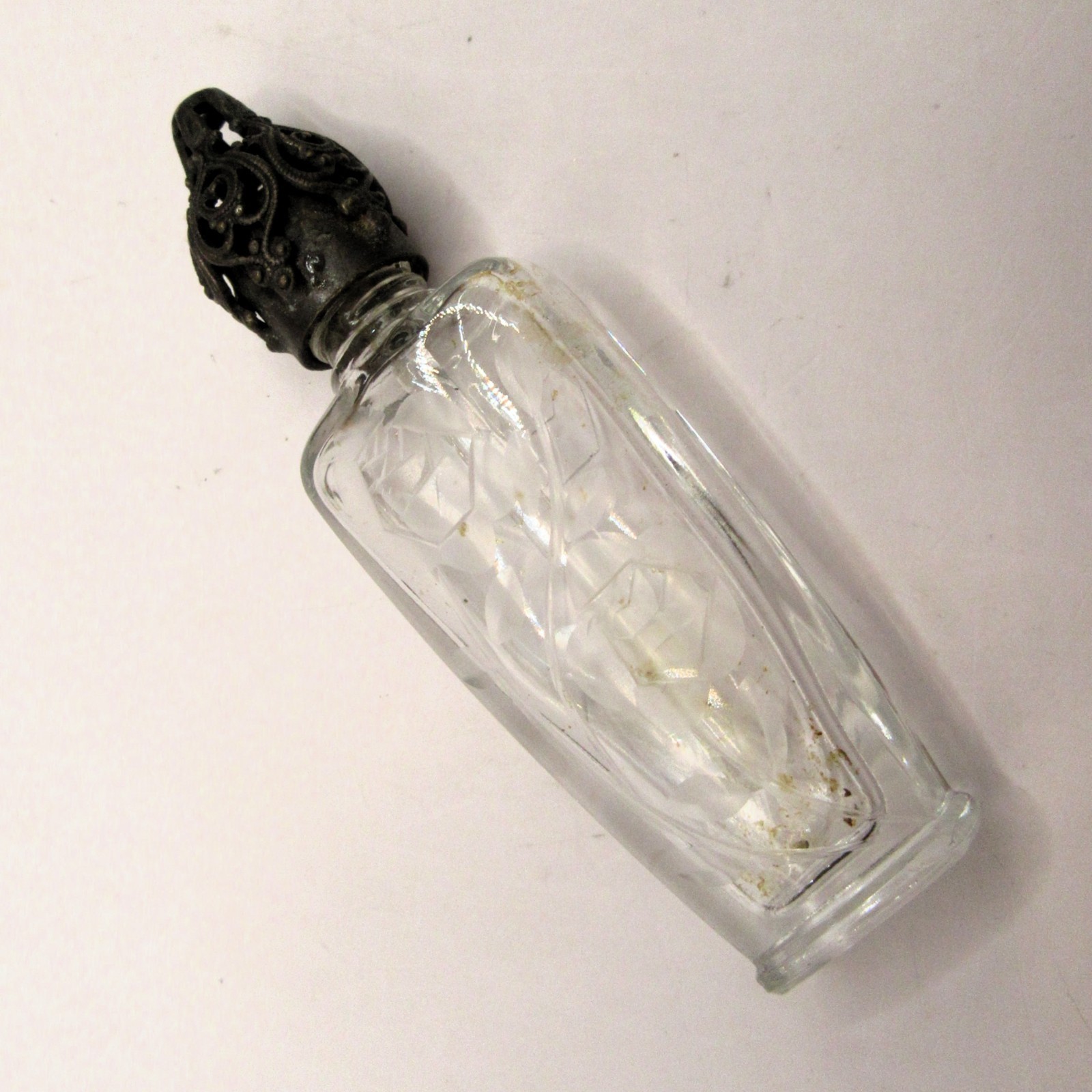 1. Le Castillere Etched Perfume Bottle, a vintage French perfume bottle dating back to the 1920s or mid-20th century. This bottle is empty, and topper has the dauber attached. The bottle is marked on bottom with ?Le Castillere?.