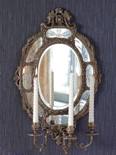 Product description: Transform your entryway or formal space with this stunning Luxu Antique European Oval Wall Mirror Candle Sconce. Meticulously crafted from champagne brass with intricate molding and beautiful floral-etched glass panels, this 23 x 15 inch statement piece brings Old World elegance to any sophisticated interior. The integrated three-candle holder beneath the mirror creates a warm, romantic ambiance while highlighting the ornate detailing of this luxury accent. Perfect for grand entryways, stair landings, or classic villa halls, this versatile piece seamlessly blends into both traditional and transitional decor schemes. The beveled mirror and robust metal framework ensure lasting beauty and timeless appeal, making this sconce not just functional illumination but a true artistic focal point for your home.