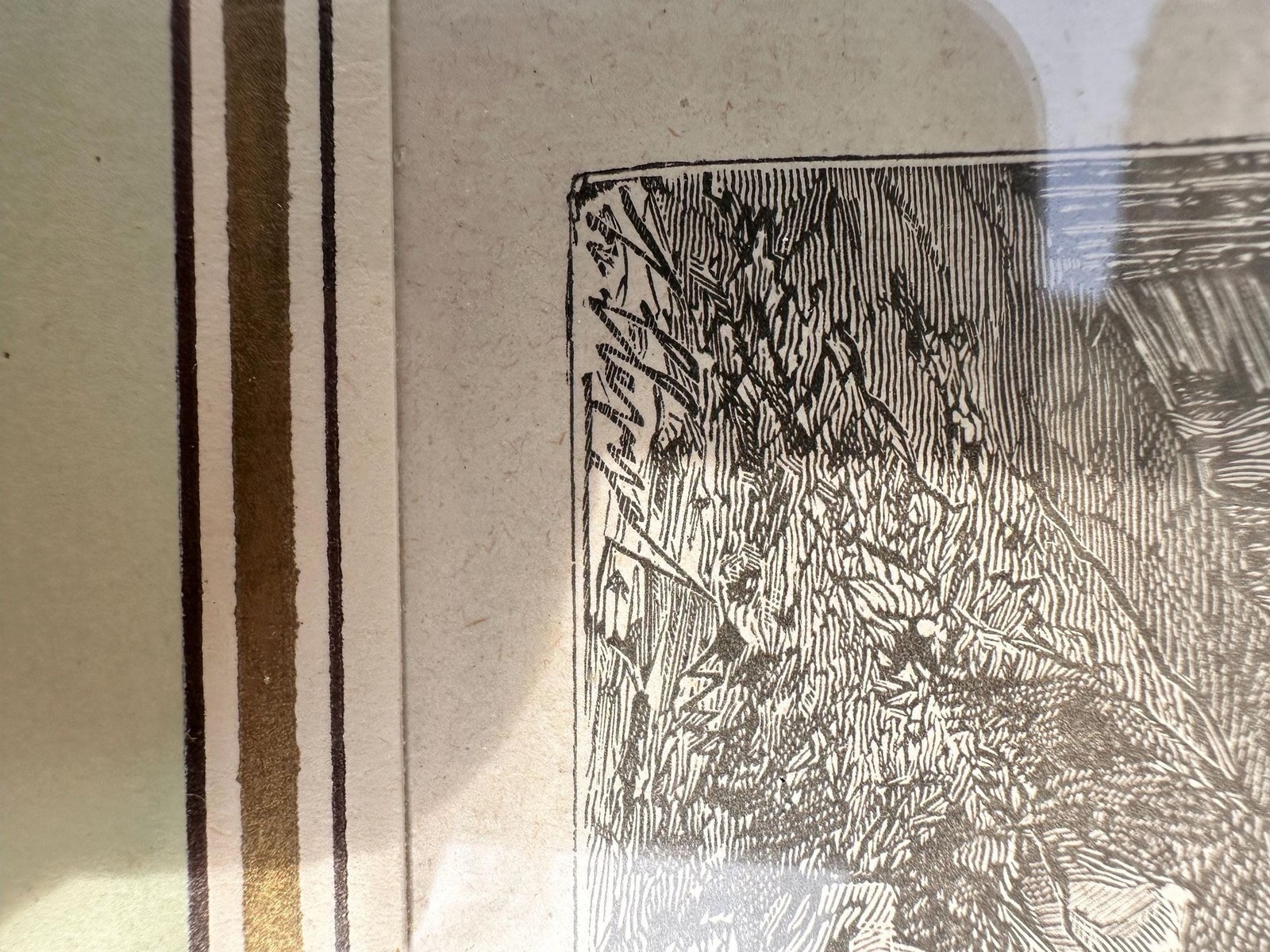 ? Framing: Gold-tone vintage frame with classic double mat (pale green and cream)