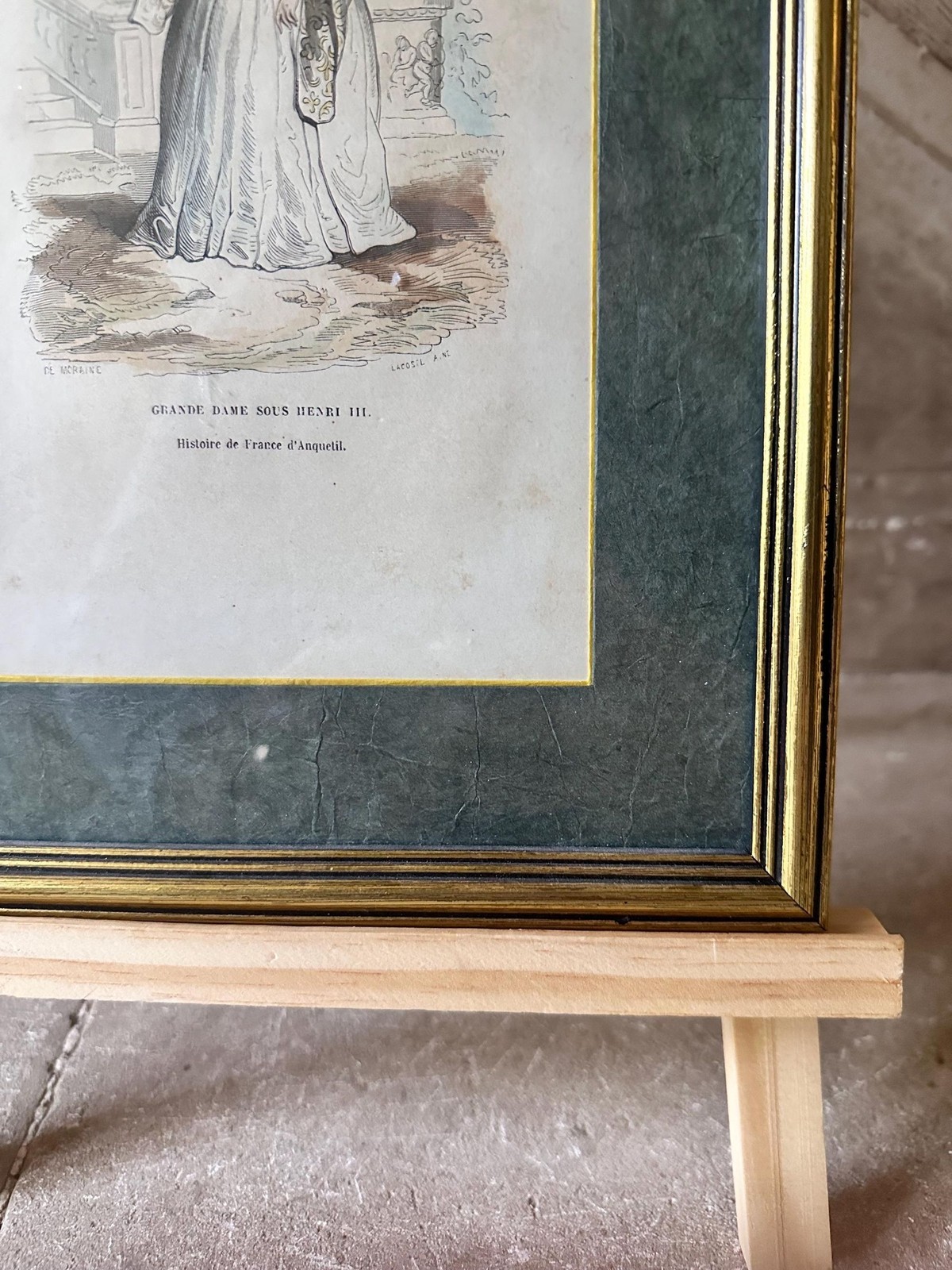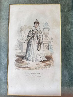 Framed in a classic gold-edged frame with a deep green mat that enhances the illustration?s delicate tones, this piece offers both visual beauty and historical interest. Whether you?re a collector of antique prints, a lover of fashion history, or simply drawn to the timeless elegance of old-world Europe, this artwork brings a whisper of the past to any interior.