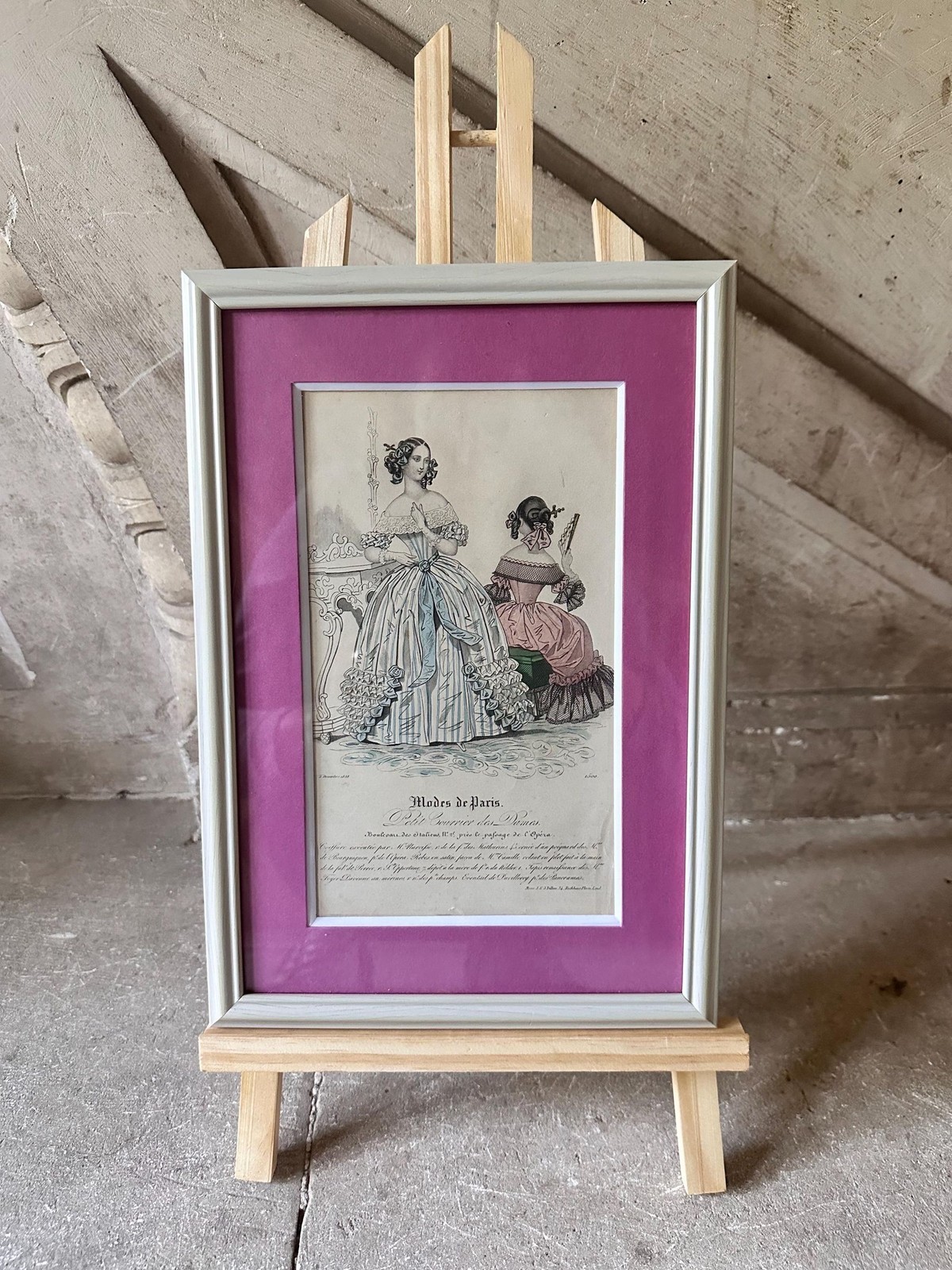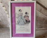 This particular print is professionally framed in soft ivory with a bold magenta mat, creating a striking contrast that brings vintage charm to both classic and modern interiors. A wonderful addition to a gallery wall, dressing room, or anyone passionate about historical fashion and French decorative arts.