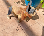 French paper Mache Growling Bulldog. Dog measures 18? long by 13.5? high. He is black and tan and has big brown glass eyes, his mouth opens and closes and makes a growling noise when you pull the chain. His feet are on wheels except one but not all move. He is wearing his original collar.