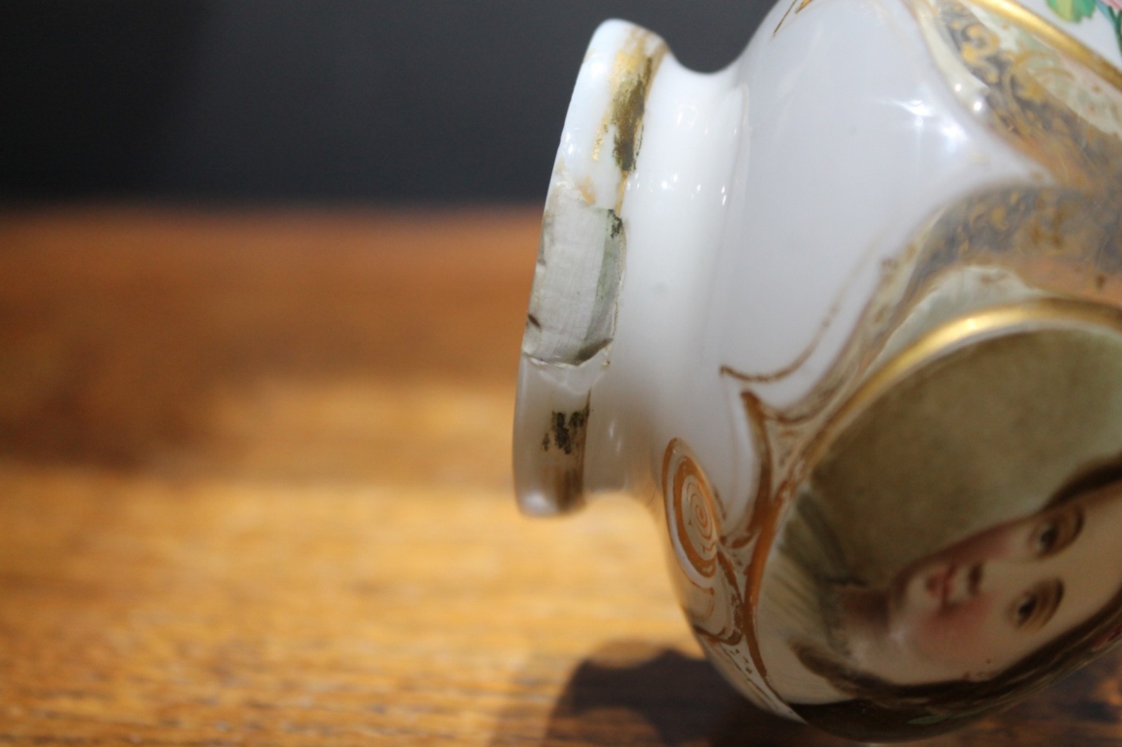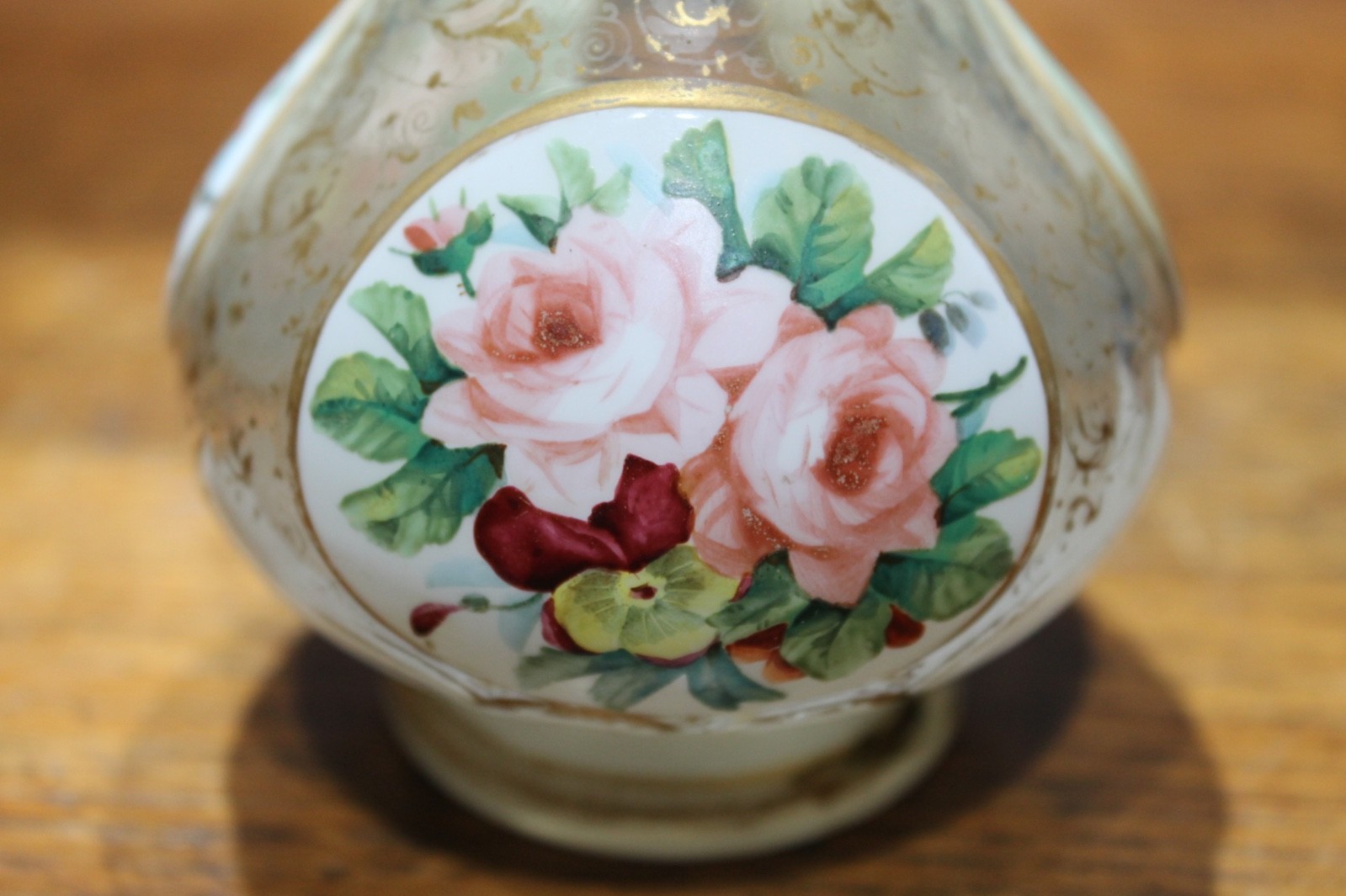 Being just 15 cm tall, it is decorated with 3 hand painted medallions , two of which contain floral bouquet and the third is of a rosy cheeked young maid..