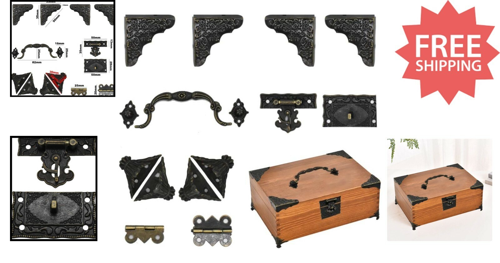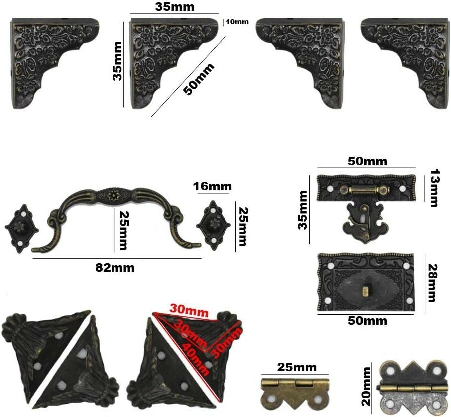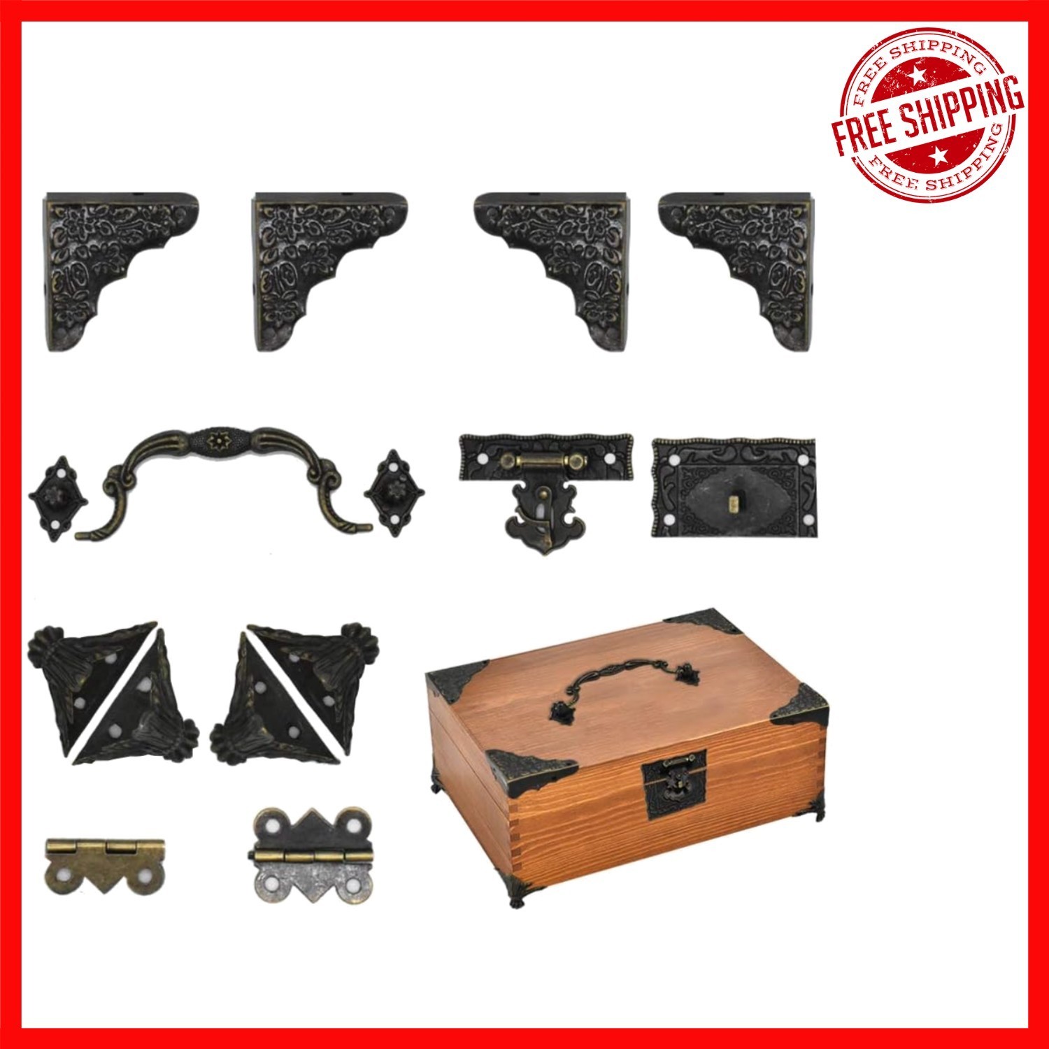 Transform your vintage projects with our comprehensive kit, which includes 2 antique lock latch hasps, 4 hinges, 2 handles, and 16 corner protectors?all crafted from durable alloy with a vintage finish. Perfect for small carpentry and DIY projects such as jewelry boxes, gift boxes, wine boxes, toolboxes, and cabinets. Whether repairing an antique heirloom or creating a unique gift, this set provides both functionality and charm.