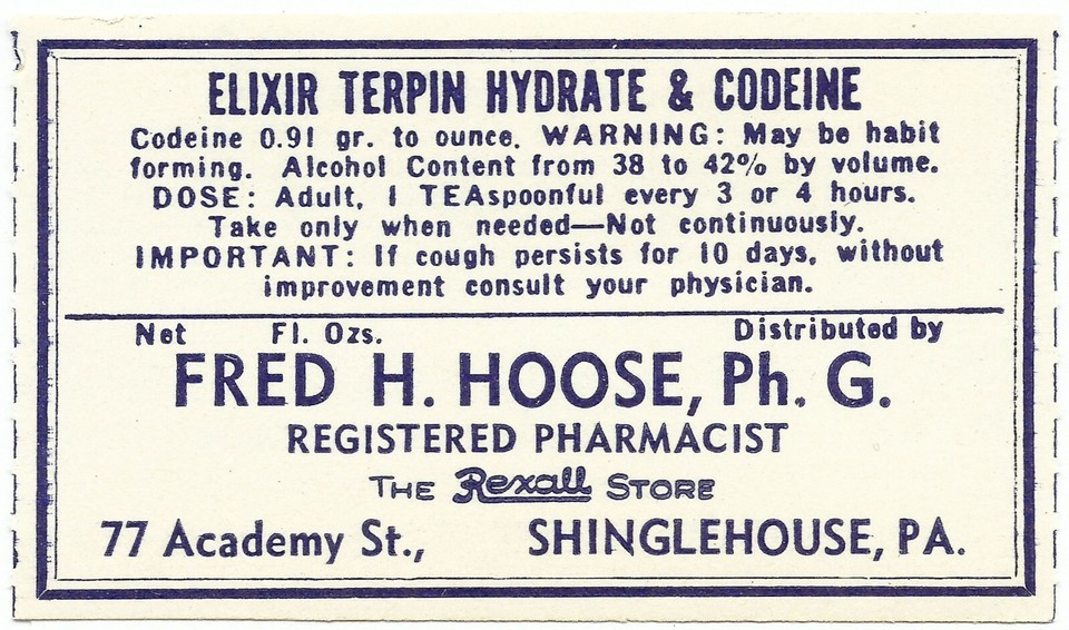 - Antique Label ELIXIR TERPIN HYDRATE & CODEINE Fred Hoose Rexall Shinglehouse PA