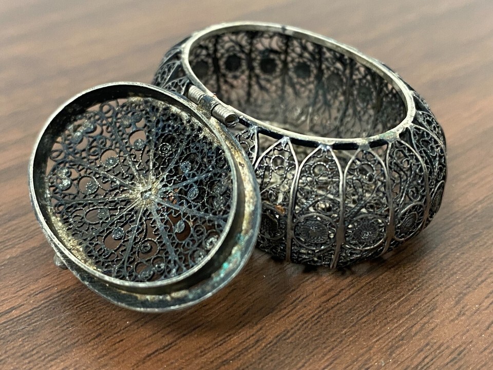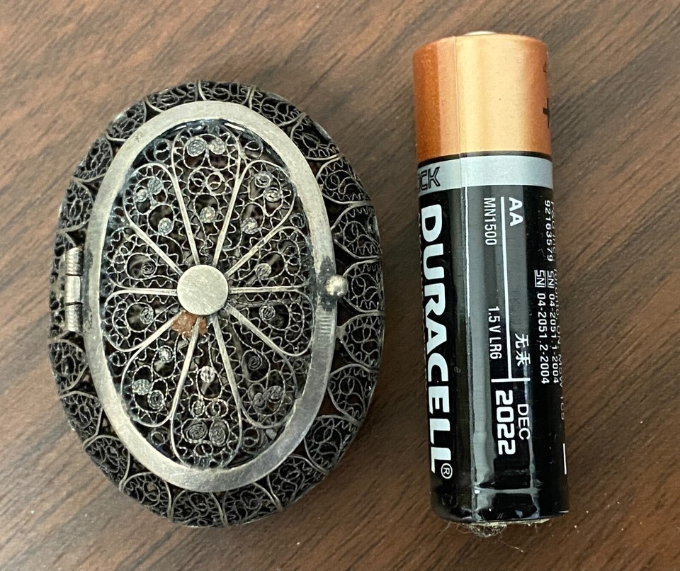 - Antique MINIATURE Sterling Silver Filigree Wire Oval Open Work Pill/Trinket Box