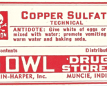 (1) NEVER USED ANTIQUE GUM BACKED PHARMACY LABEL ENTITLED COPPER SULFATE (TECHNICAL) POISON WITH SKULL AND BONES FROM THE OWL DRUG STORES IN MUNCIE, INDIANA. NOTE - THIS LABEL IS AN IMPERFECT AND SLIGHTLY OFF SQUARE. THIS GENUINE ANTIQUE PHARMACY LABEL MEASURES 2 3/8" wide X 1 3/8" tall, FROM THE 1930s OR 1940s, LIKELY EARLIER. COPPER SULFATE WAS OFTEN PRESENT IN THE PHARMACY OR SOLD OVER THE COUNTER BY THE PHARMACIST.. THIS LABEL INDICATES THE CONTENTS COPPER SULFATE (TECHNICAL), POISON, AND CAUTIONS FEATURING BRIGHT SKULL AND BONES PICTOGRAM, AND ANTIDOTE INFORMATION, MADE OF PAPER WITH GUM BACKING. THIS GUMMED PAPER LABEL WAS OFTEN USED BY THE PHARMACIST WHEN DISPENSING THEIR REMEDY, OFTEN OVER THE COUNTER AS A PROPRIETARY COMPOUND OR MEDICINE, OTHER TIMES, WITH A DOCTORS PRESCRIPTION. THIS MEDICINE BOTTLE GUMMED LABEL WAS APPLIED TO THE DRUGGIST BOTTLE, JAR OR OTHER PHARMACY PACKAGING (sometimes a small box) TO HELP ALONG SALES, OFTEN BEAUTIFUL BRIGHT DETAIL PRINTING, WITH COLORFUL AND VIVID INKS. THIS GENUINE ANTIQUE DRUG LABEL IS OFTEN KNOWN AS A PHARMACY LABEL, PHARMACIST LABEL, MEDICINE BOTTLE LABEL, DRUG STORE LABEL, APOTHECARY LABEL, etc. THE LOWER PORTION OF THIS LABEL IS THE DRUG STORE NAME, THE OWL DRUG STORES, PERRIN-HARPER, INCORPORATED IN MUNCIE INDIANA. YOU WILL RECEIVE ONE (1) ANTIQUE PHARMACY LABEL ENTITLED COPPER SULFATE, JUST AS PICTURED, SHIPPED BY USPS.....
