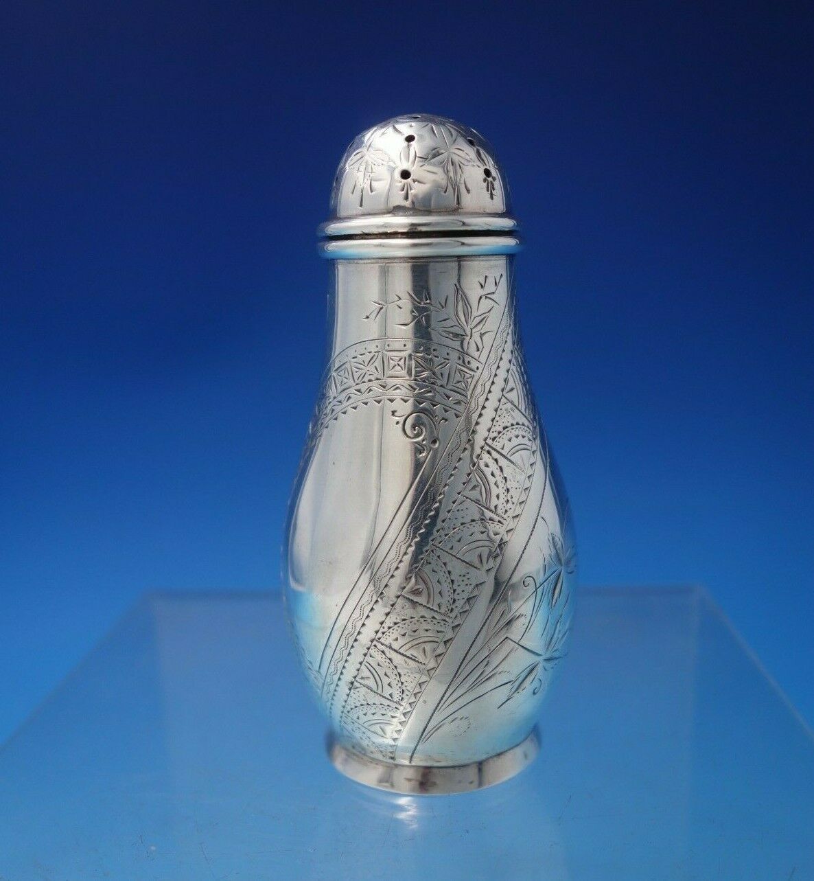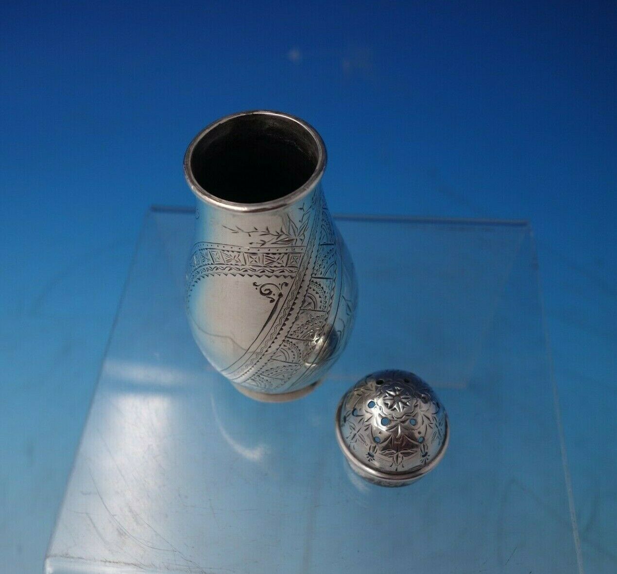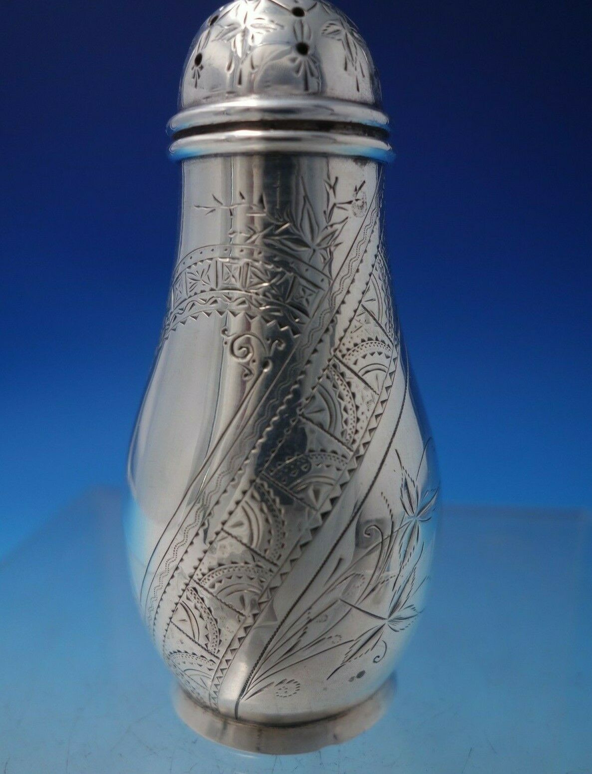 Superb Antique Rosette by Whiting sterling silver bright-cut salt and pepper shaker pair marked #30. The shakers measure 3 1/2" tall x 1 3/8" and together weigh 3.7 troy ounces. They are not monogrammed and are in good vintage condition. Wonderful!