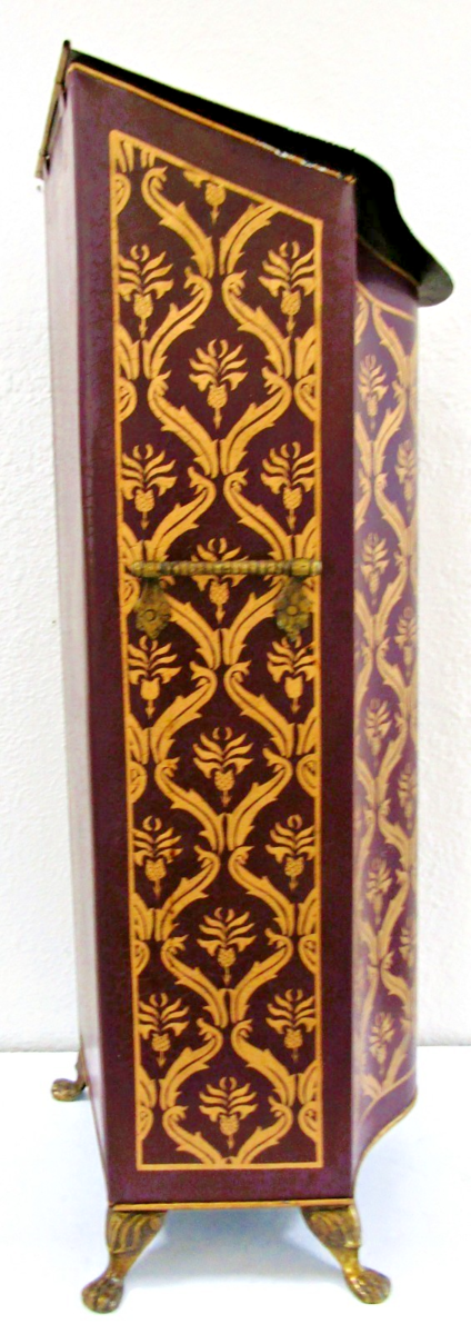 With lid, spiral grooved brass handles, brass finished metal claw feet and a burgundy and gold damask pattern over a crackled surface.