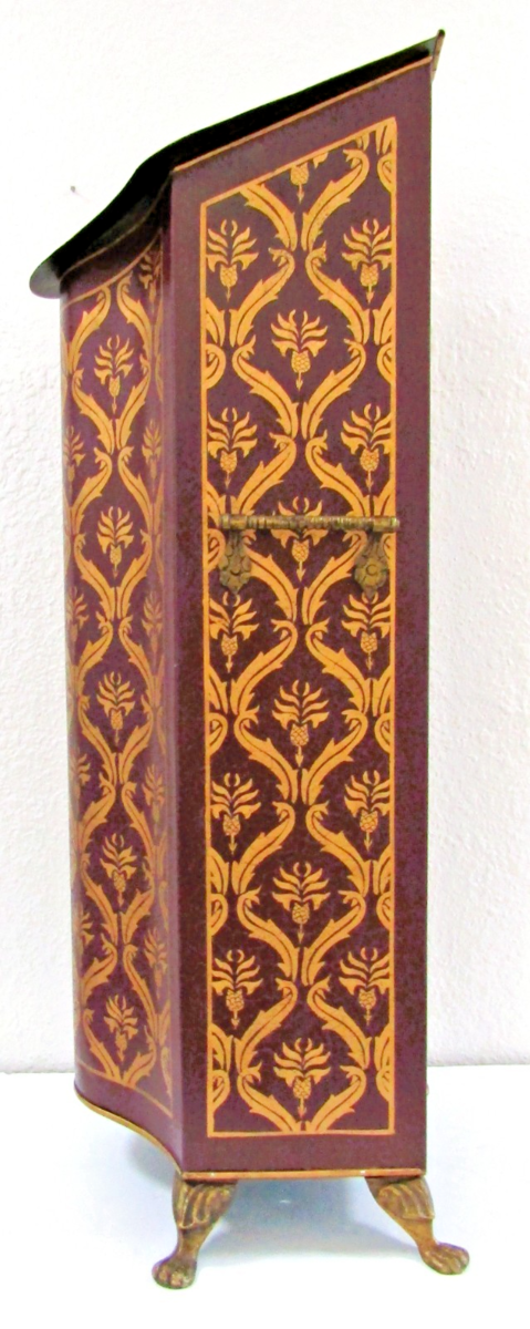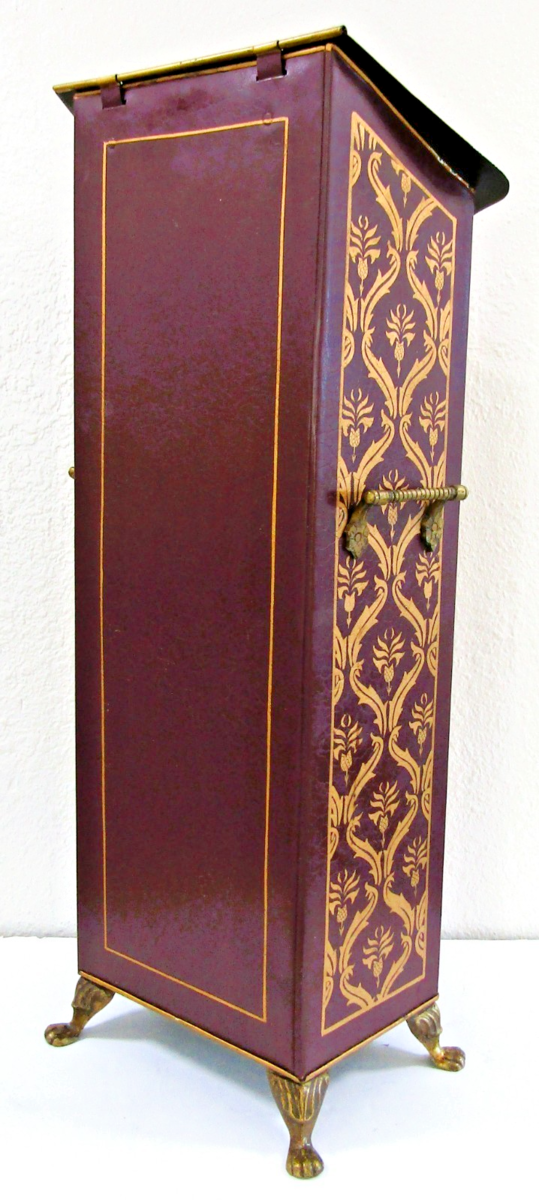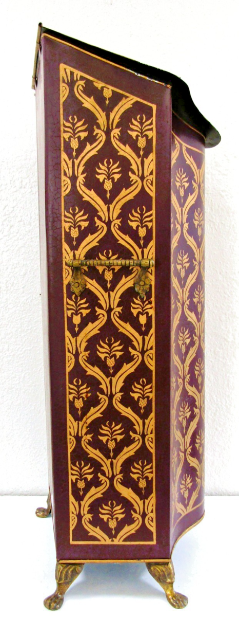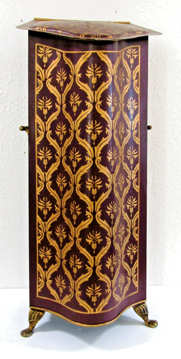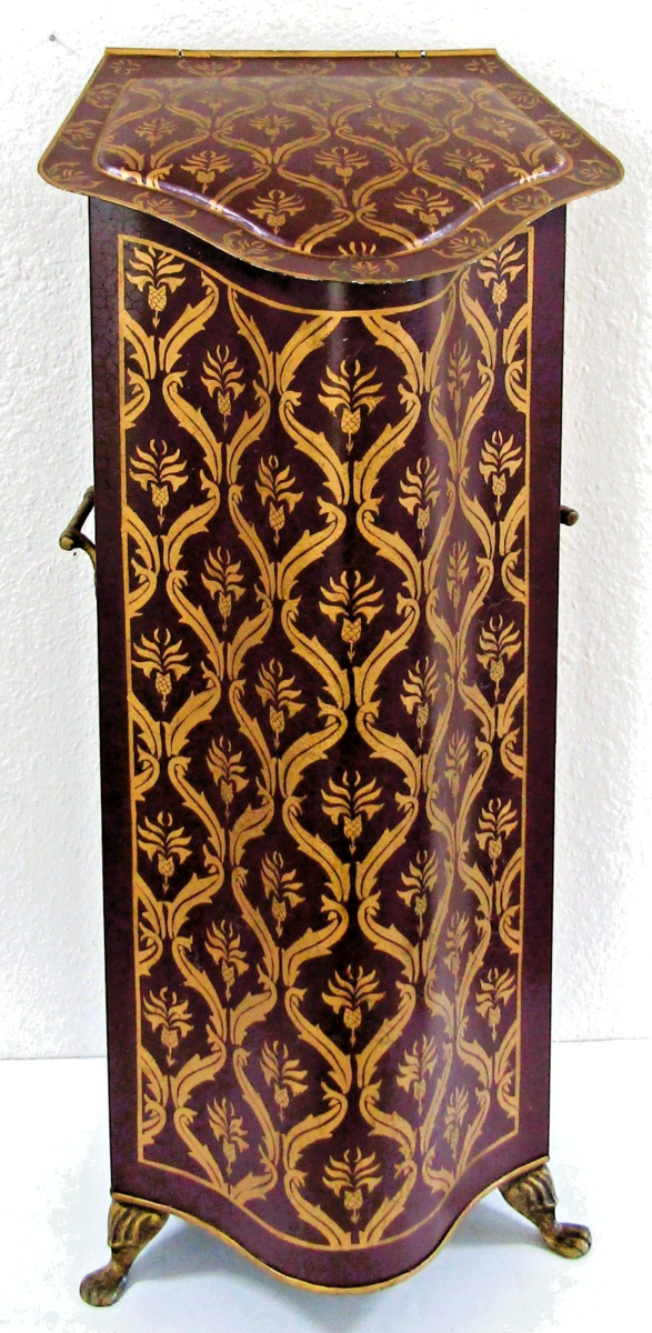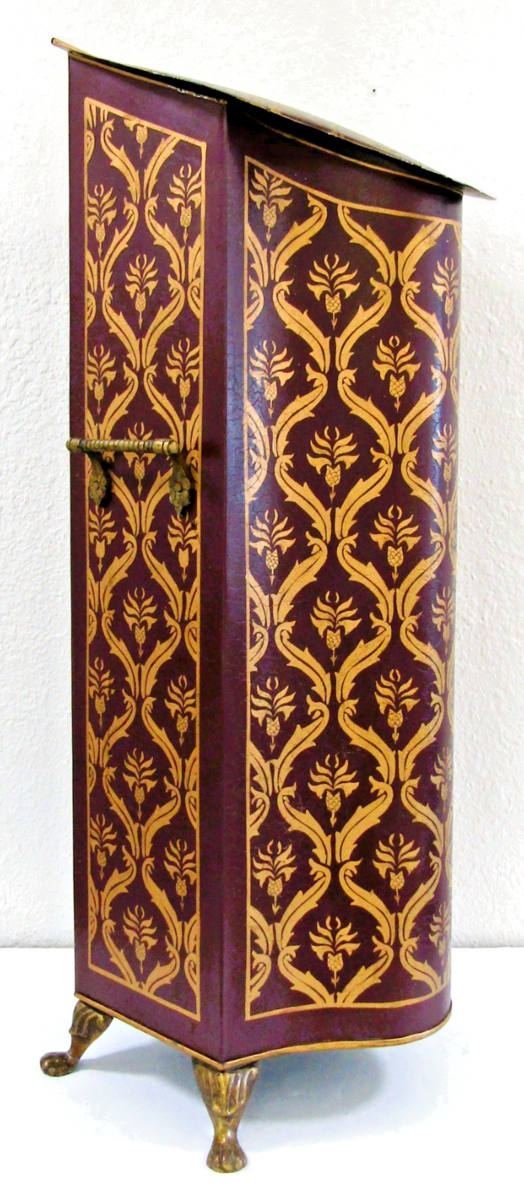 - Antique Tall Decorative Tôleware Coal Scuttle Burgundy and Gold Damask Pattern