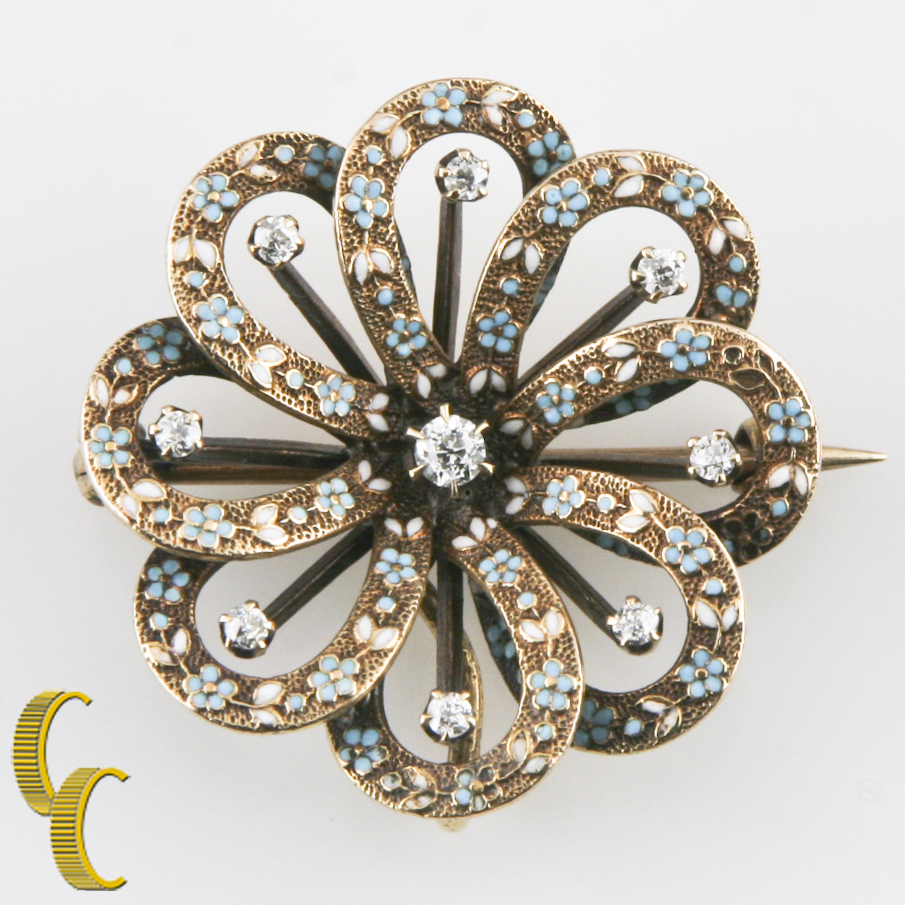 - Antique/Vintage 14K Yellow Gold, Diamond & Enamel Ribbon Brooch 6.2 grams