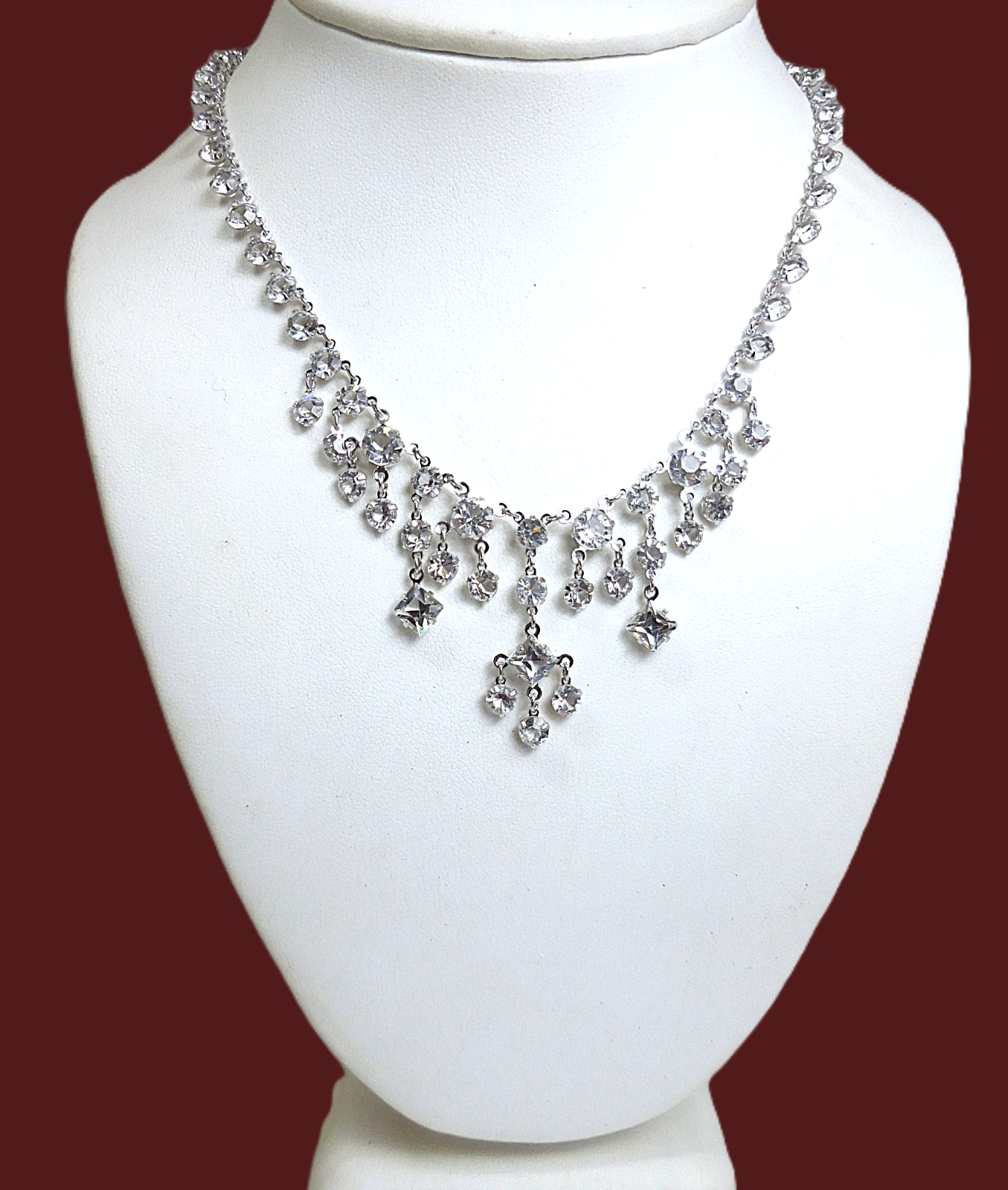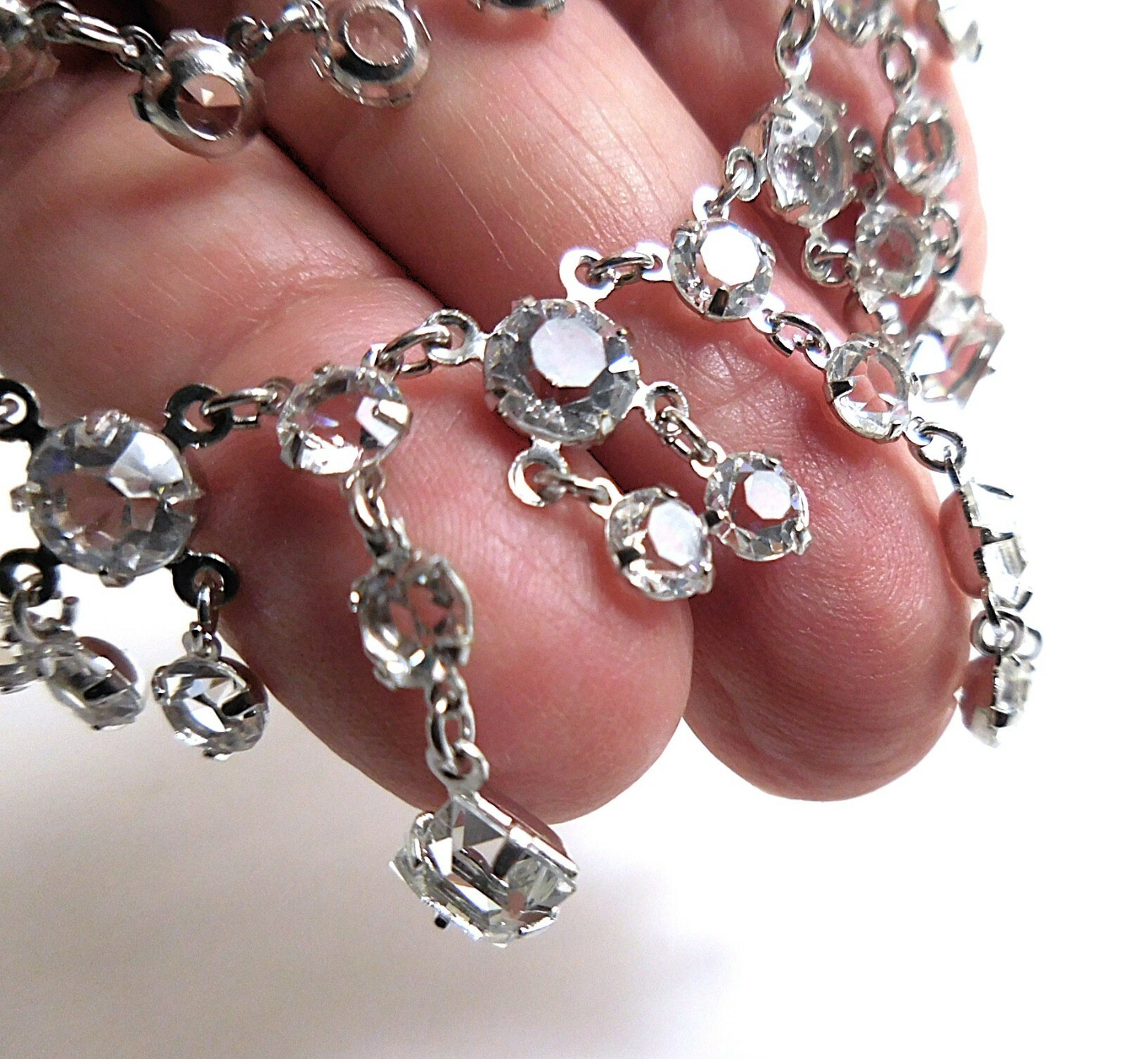 Every time I find one of these Art Deco open-back crystal necklaces I am still amazed by their beauty. They sparkle and shine like diamonds glittering around your neck. This one has dangles at the center, so it allows lots of movement and allows it to catch the light. The crystal stones are clear with rainbow colors when turned in high or low lights. Perfect for special occasions, sure to dazzle and be noticed. Unsigned but lovely.