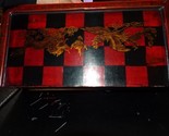 Board: Hinged wooden case with gold dragon phoenix motif over red/black checkered lacquer surface