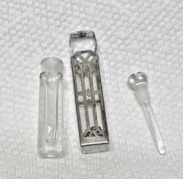 Antique Wells Sterling Silver Crystal Miniature Perfume Scent Bottle In Cage full length is 2 1/4 x 3/8 x 1/2 the bottle will come out and the dauber is in great shape with a ground rim for fit
