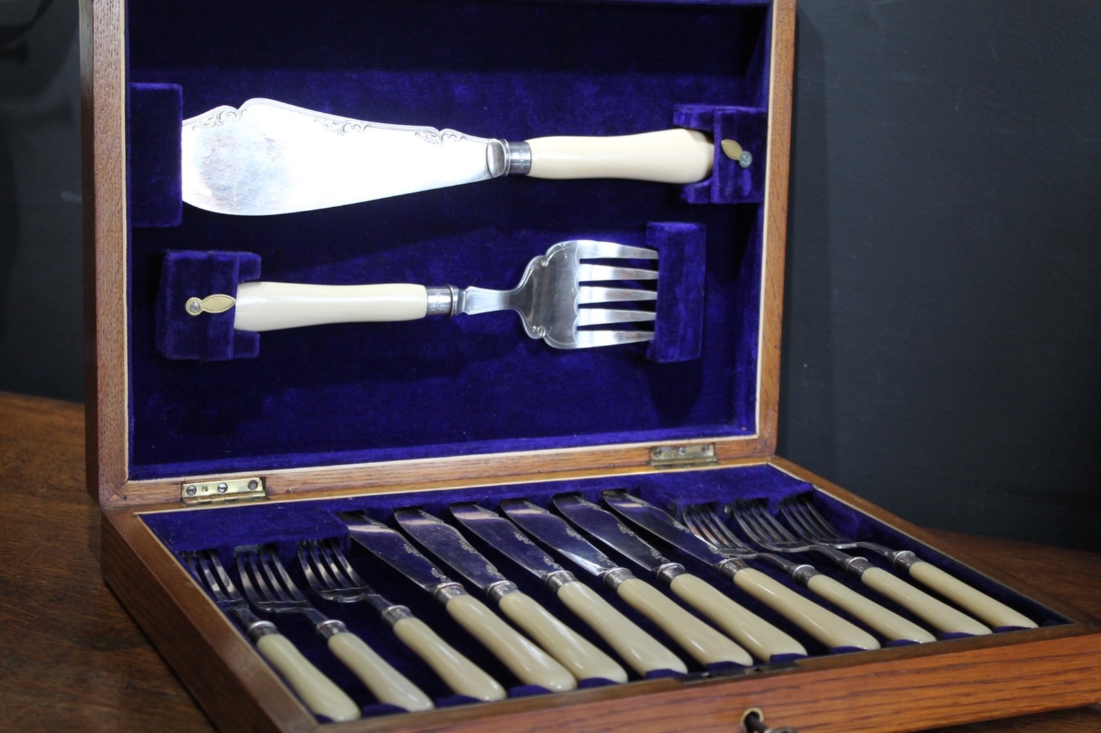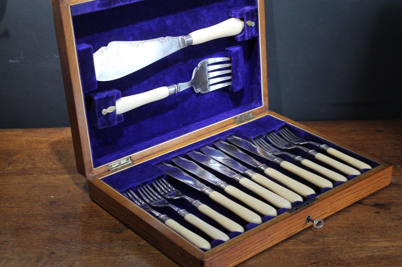 A boxed set of 6 antique knives and forks together with servers cutlery.