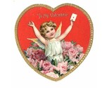 Antique die cut embossed Victorian Valentine greeting card in Heart with an angel and pink roses