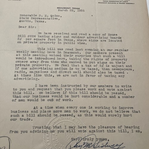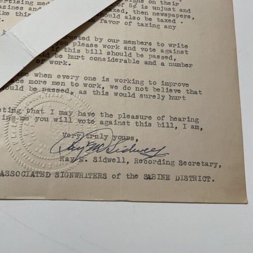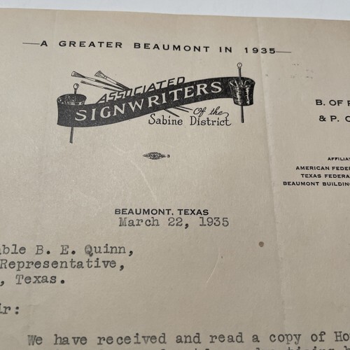 - Antique letter Associated Sign Writers of the Sabine Distrist 1935 Beaumont Tx