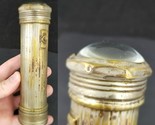 6 1/2" long. The perfect amount of patina to show of its age. No cracks or chips in the glass. Switch still moves. Looks to be missing the bulb holder.