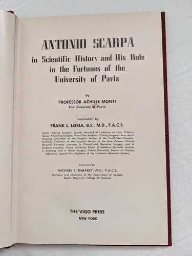 A vendre est une couverture rigide d'occasion 1ere edition americaine exemplaire de l'Histoire scientifique d'Antonio Scarpa et son role dans la fortune de l'Universite de Pavie Achille Monti publie par Vigio Press.