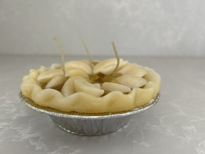 The Apple Pie 5" Candle is a specialized candle shaped like a pie, with a yellow color and a holiday theme. It features 3 wicks and emits an apple scent, creating a cozy and festive atmosphere in any room. This small-sized candle is perfect for adding a touch of warmth and celebration to your home during the holidays or any time of year. Some pieces are a little loose. Don?t think you would ever want to light this. Just too pretty!!!