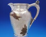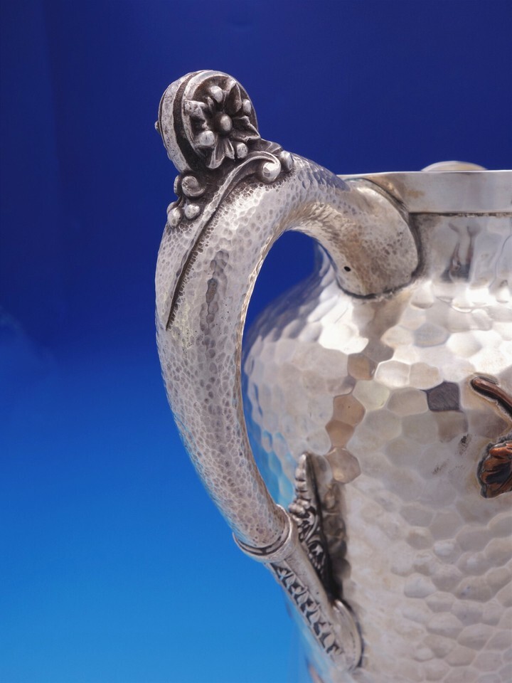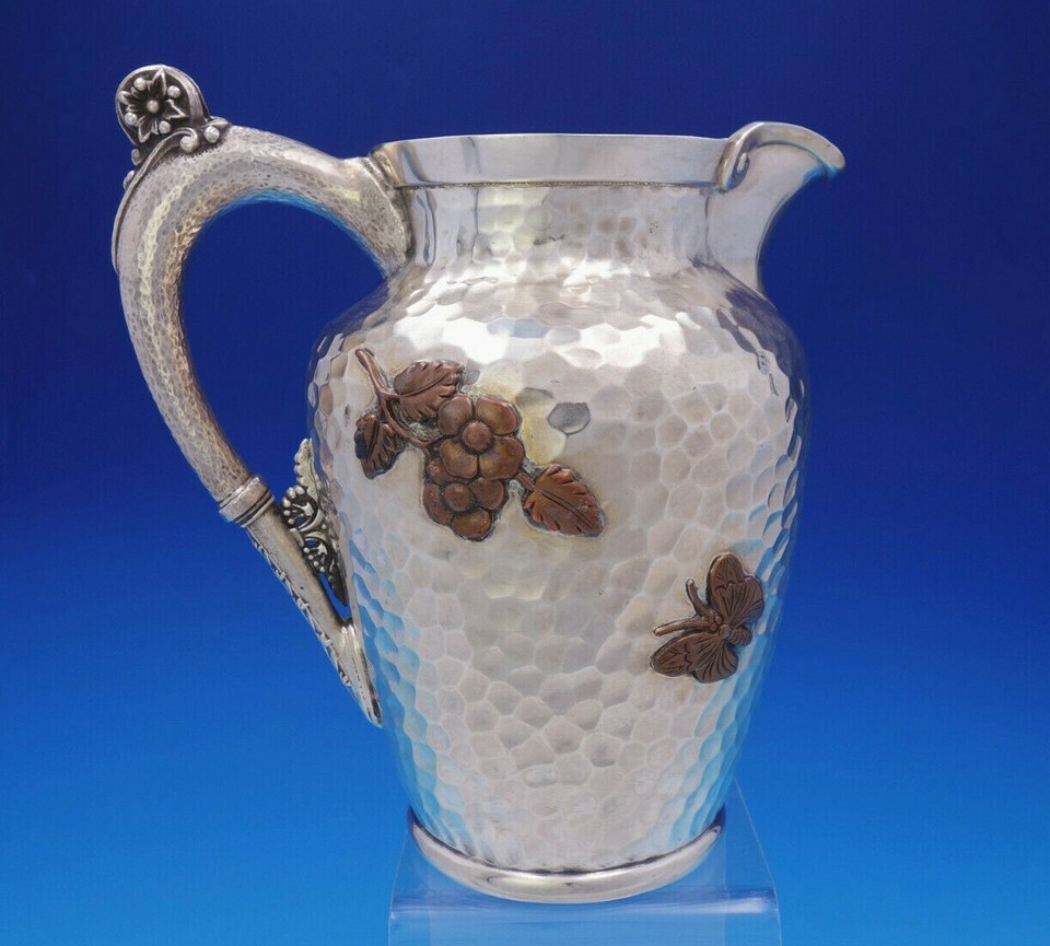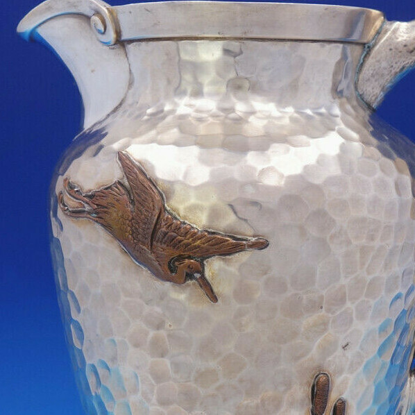 Museum quality Gorham sterling silver water pitcher #740. It is adorned with applied copper elements including flowers, an applied copper butterfly, applied large stork/egret/bird in flight, and applied copper cattails. There are also applied sterling elements on the rim and rosettes on handle and the interior is gold washed.