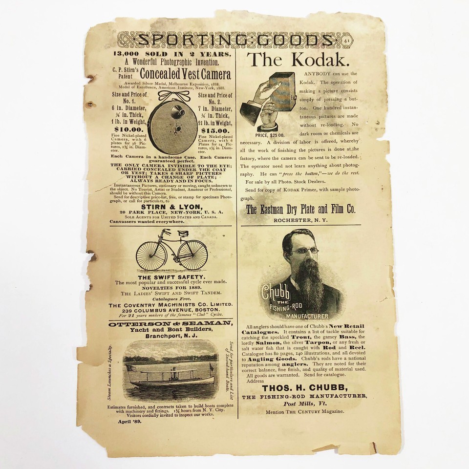 Vintage April 1889 Advertising Page from Scribner's Magazine Cameras, Chubb Fishing Rods, Smith Wesson Pistols