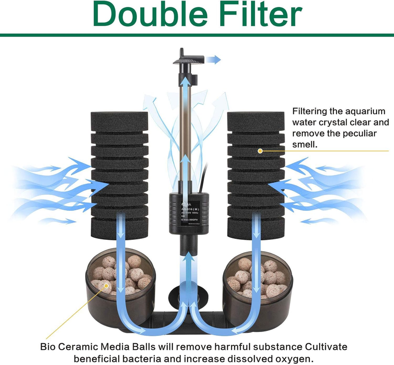 Double Filter: Physical Filtration+Biochemical Filtration; The biochemical cotton adopts a ribbing design to increase the surface area and filter out automatically absorb feces, debris and residues in water; Bio ceramic media balls improve the filtering effect, can quickly purify the water quality; Ceramic balls can also be replaced by other filter materials