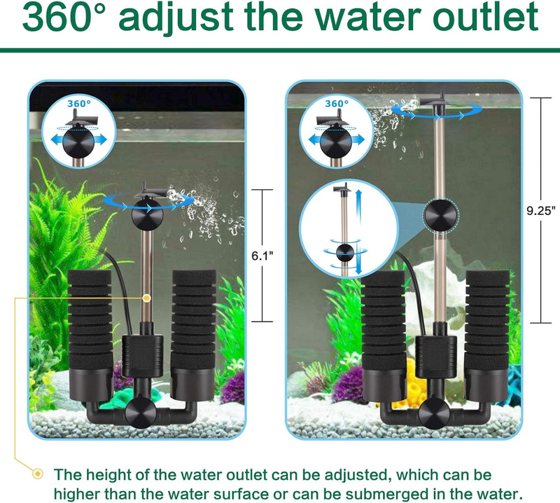 Water Outlet Can be Adjusted 360and Stretch: The retractable water outlet can be adapted to fish tanks of various depths, and the water outlet can be submerged in the water or out of the water; Filtration can not only purify water quality and increase water circulation, but also increase the oxygen content in the water