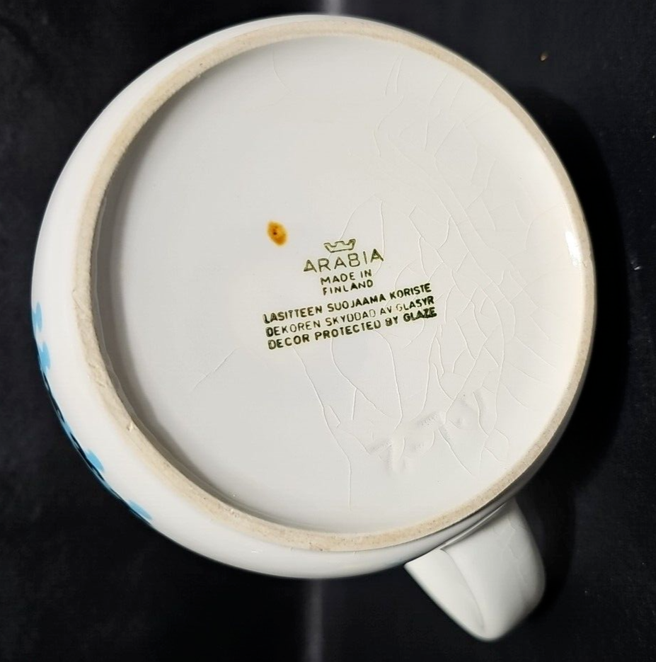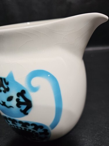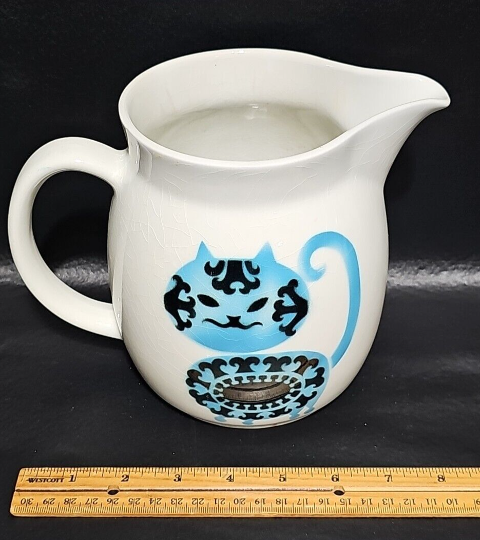 UP FOR SALE: Arabia Finland Blue Loose Headed Cat Pottery Pitcher Vintage mid-century cat pottery pitcher in excellent condition. No chips or cracks but it does have crazing throughout as is very normal for this brand and it's age. Pitcher measures 6 1/2" tall and 8" wide from spout to handle. Marked on the bottom Arabia Made in Finland and embossed K-L-2