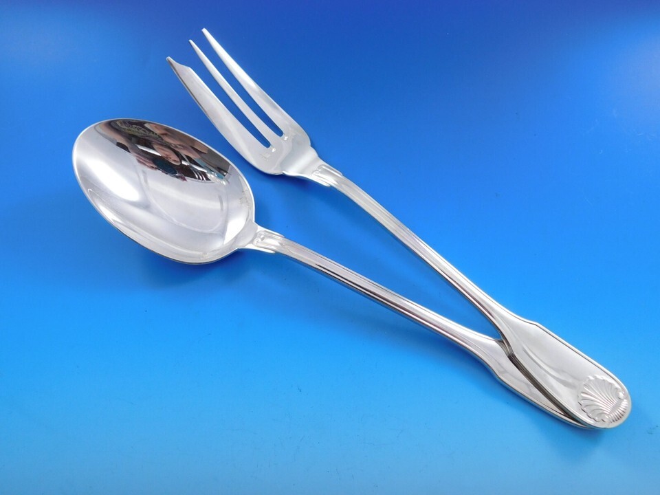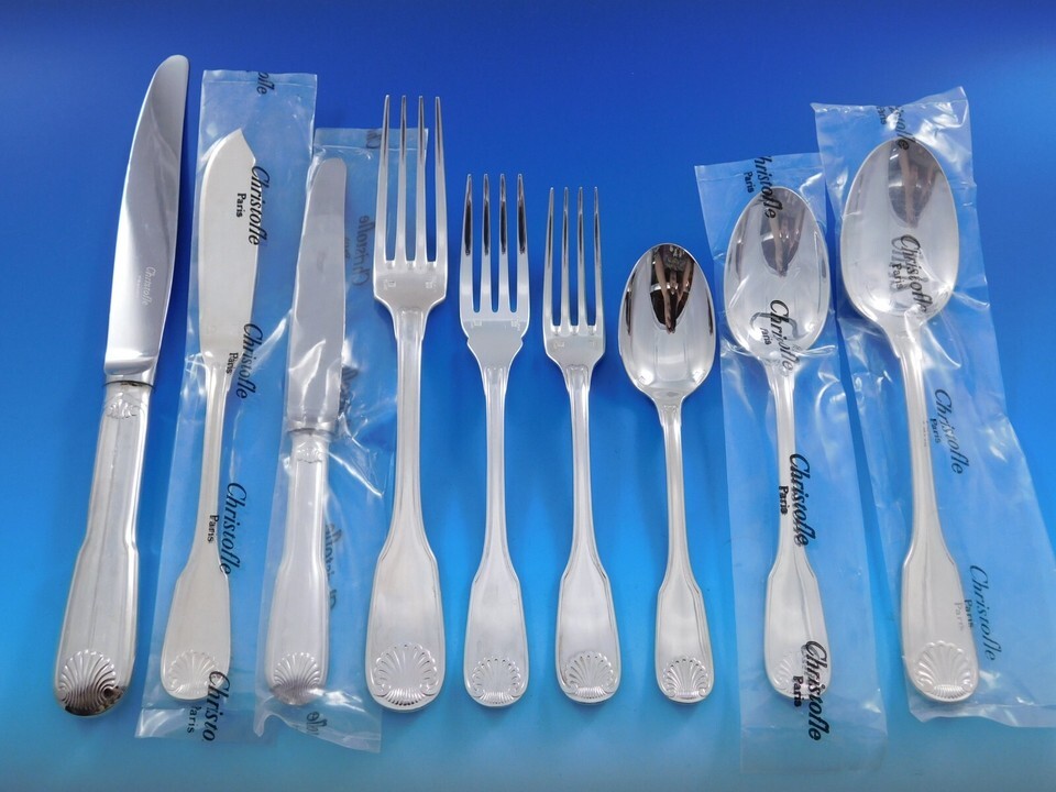 Dinner Size Arcantia aka Vendome by Christofle France Silverplated flatware set, 121 pieces. This pattern features the same shell motif that adorned the ceremonial silverware used during the reign of King Louis XIV. This set includes: